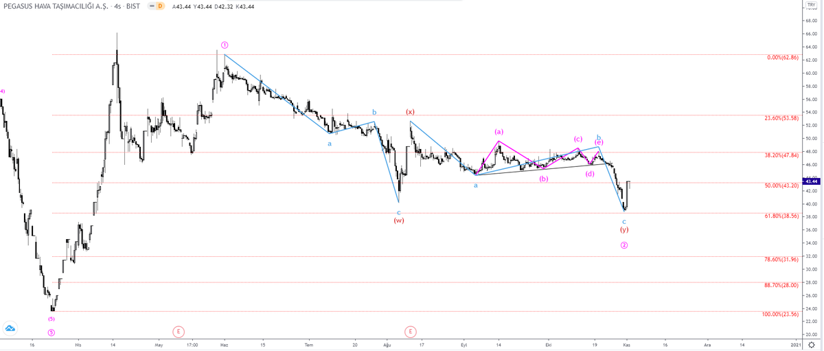 son olarak ; #pgsus#pegasus için de benzer durum geçerli ancak orada bir abc değil wxy oluşumu göze çarpıyor. 2. dalga 1. dalganın %61.8'ini neredeyse nokta atışı şekilde geri almış durumda.