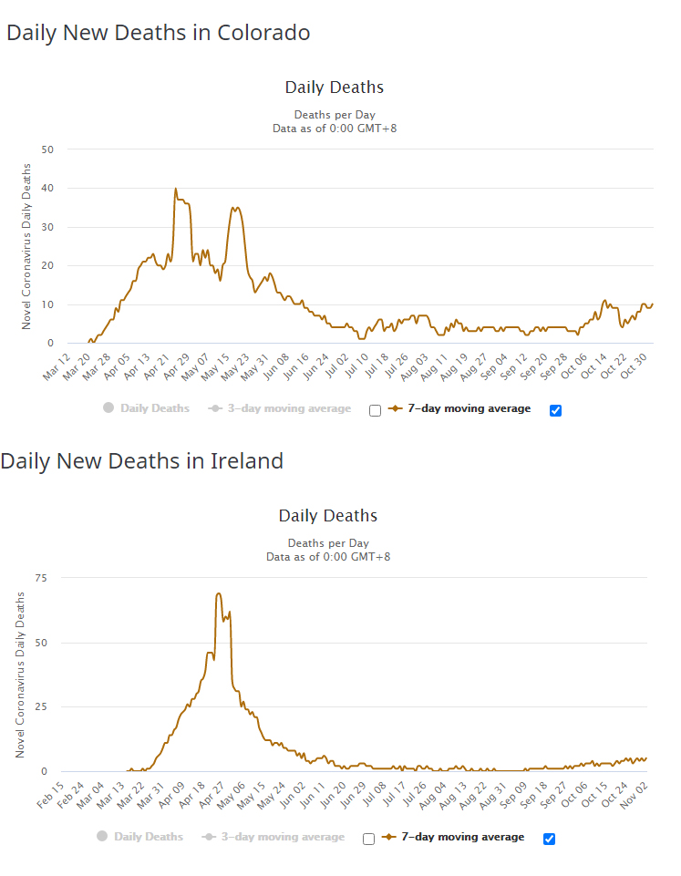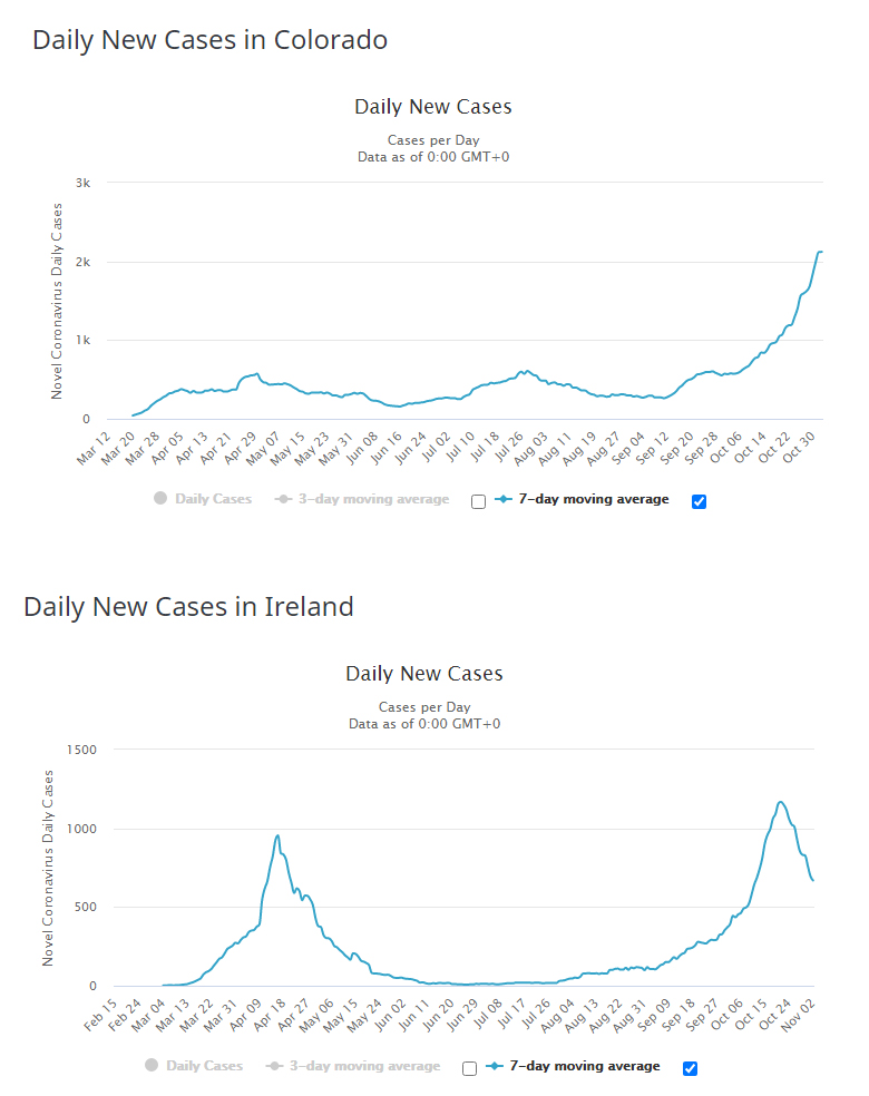 My point is: Colorado needs to hold on & NOT lockdown. Ireland is real world evidence out there that Covid doesn't race uncontrolled for long. Ireland saw its peak at about 1,200 cases/day after about 2 months of growth. If CO follows suit, we could see a peak very soon.