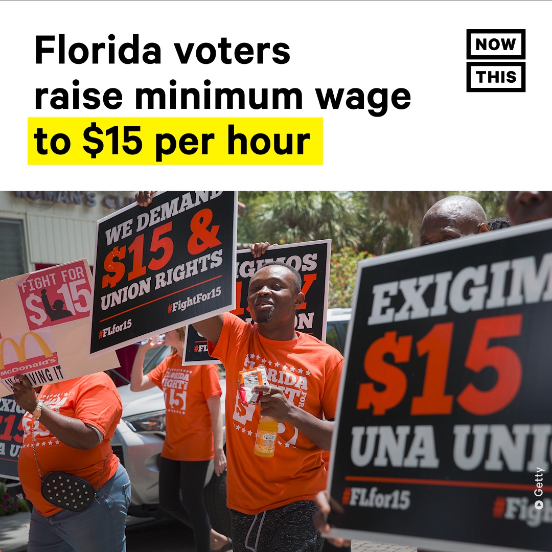 The change will increase wages for roughly 2.5 million workers in Florida, according to Florida Policy Institute. The trend toward a $15 minimum wage, now part of the Democratic Party’s platform, has gained traction in the past few years.