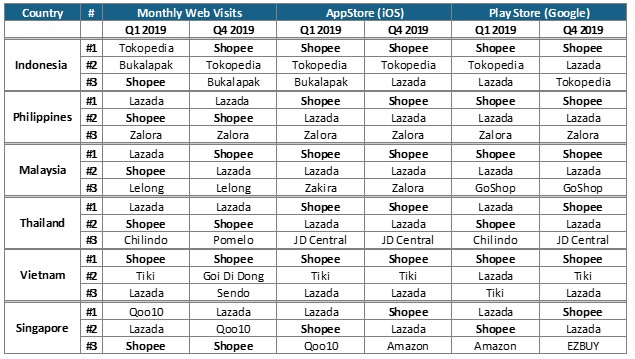 La popularidad de Shopee difiere en diferentes partes del sudeste asiático. Pero domina el uso a través del móvil en la mayoría de los países.