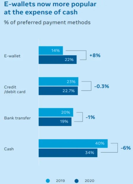 Las e-wallet muestran un aumento del 8%, igualando el uso de la tarjeta de crédito y débito en el 2020.