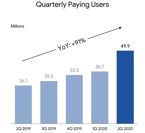 En cuanto a los sectores, Garena aumentó el año pasado sus ventas un 167.4%, pasando de 661 millones de dólares a 1800 millones. Este año, en el segundo trimestre lleva un aumento con respecto al 2019 de un 61.6%, creciendo además los usuarios de pago un 91.2% YoY.