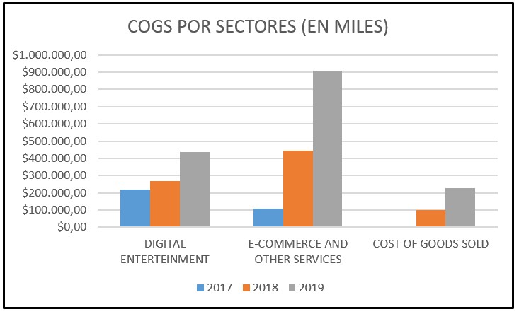 En cuanto vemos los COGS, la parte que más dinero se lleva claramente es la del e-commerce. De hecho, supone un 57.78% de los COGS, y cada año aumenta su porcentaje.