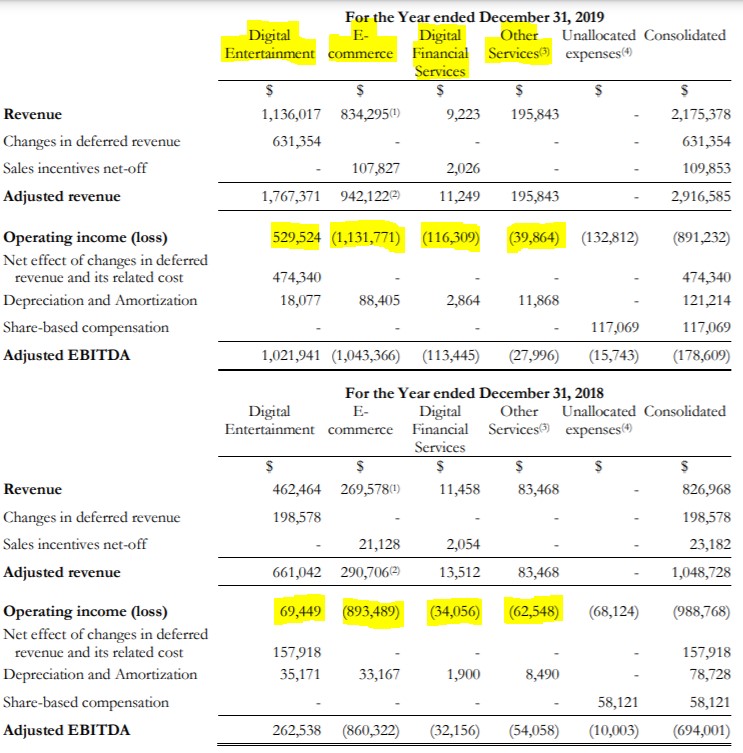 Garena constituye la mayor parte de los ingresos y la única que ha sido rentable, tanto el año pasado como lo que va de 2020. En cambio Shopee está mostrando un crecimiento en ingresos, pero también en pérdidas operativas, ya q éstas no han parado de crecer en los últimos 3 años