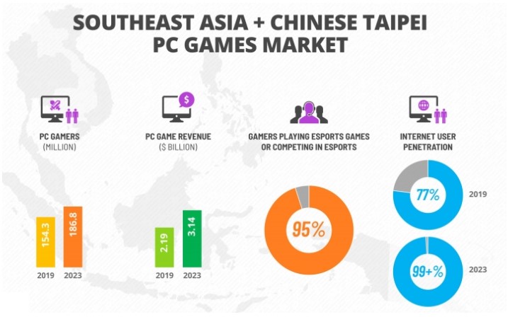Los ingresos de juegos para ordenador y juegos móviles para el sudeste asiático superarán los 5 mil millones en 2019, y se prevé que superen los 8,3 mil millones en 2023 con 320 millones de jugadores.