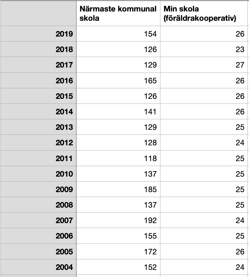 I annan tråd pågår diskussion om huruvida kommunala skolor har ett kostnadsdrivande ansvar för elevtalsförändringar som inte friskolor har. Jag har gjort en tabell över hur antalet niondeklassare förändrats på den friskola jag jobbade på i många år och på närmaste kommunala skola