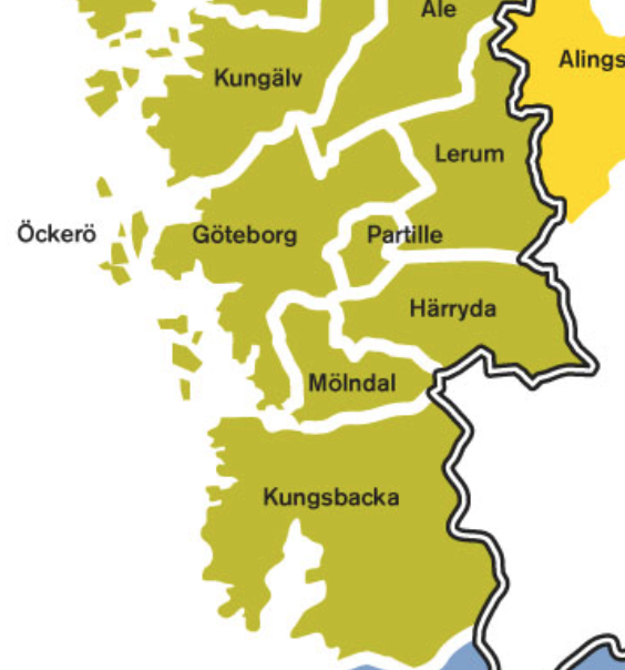 Det här är Göteborgsregionens kommuner. Det finns snart tre IES-skolor i Göteborgs stad. En ligger precis på gränsen till Mölndal. Kungälv lär vara nästa offer. Ale? Ja, kanske.