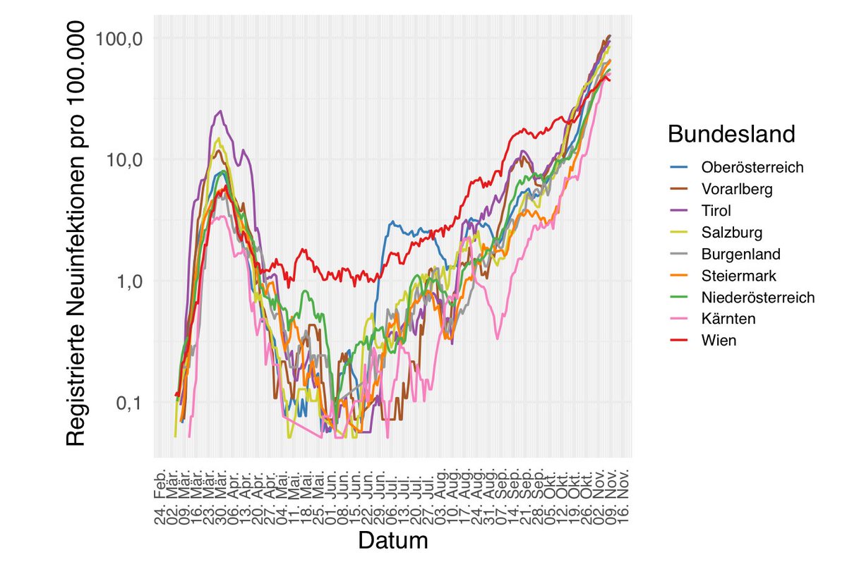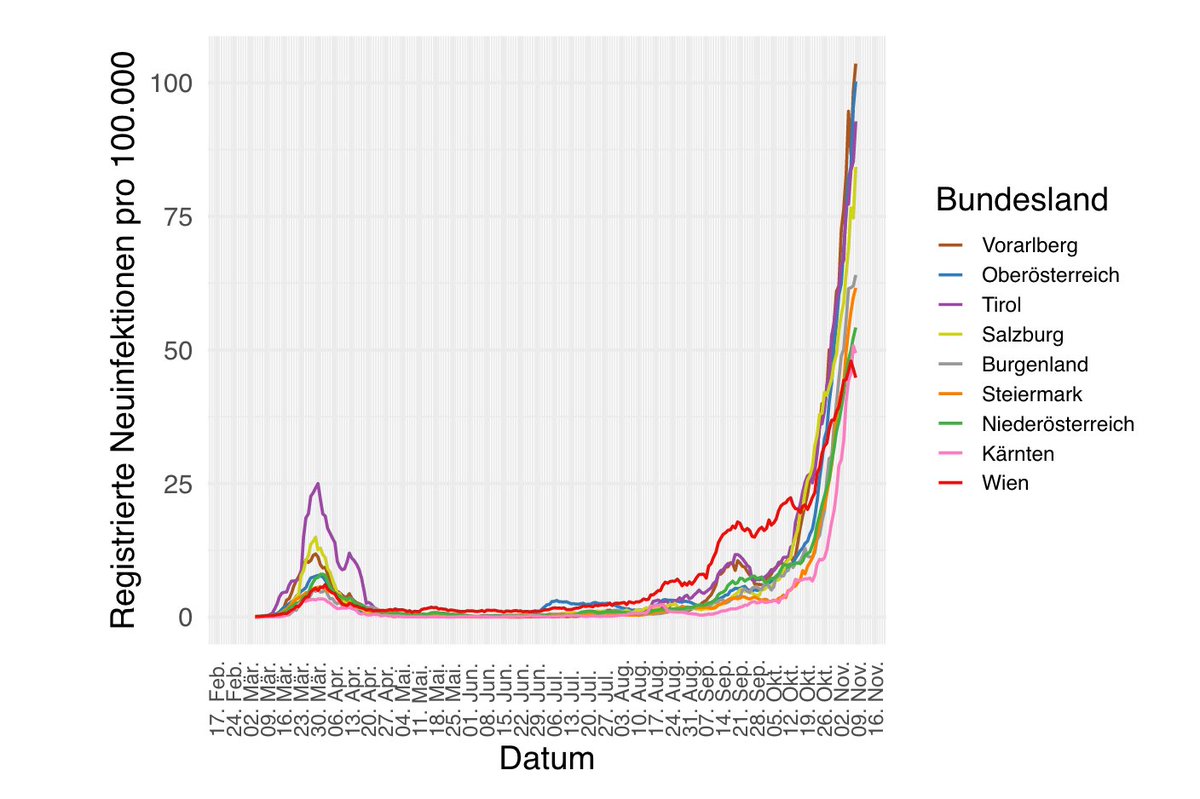 Wien hat derzeit von allen Bundesländern die niedrigste Positivrate und die niedrigsten Neuinzidenden pro 100.000 Einwohner.