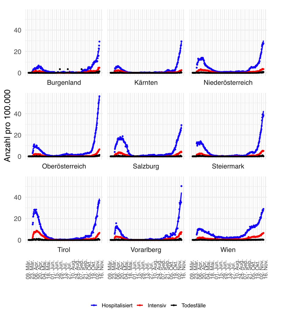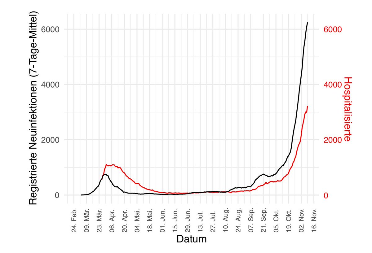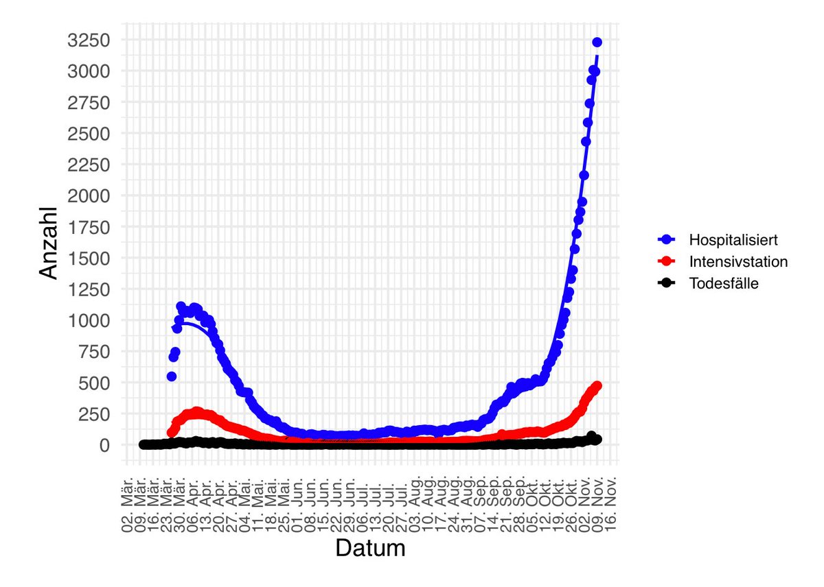 Heute(9:30) 3549 Hositalisierte, 321 mehr als gestern. 495 Fälle auf der Intensivstation, 22 mehr als gestern. Und 45 COVID-Todesfälle.