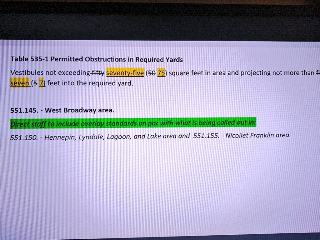 Here's a change approved earlier: setting pedestrian friendly building standards for West Broadway that are on par with streets in south Minneapolis.
