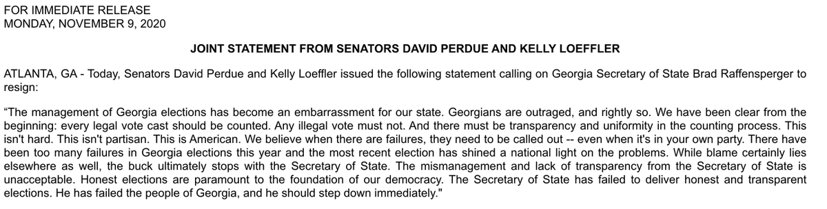 Georgia GOP Senators Perdue and Loeffler,now both facing #GASen runoff elections,call on Georgia Sec of State Brad Raffensperger to resign:“The management of GA elections has become an embarrassment for our state..He has failed the people of GA,& he should step down immediately."