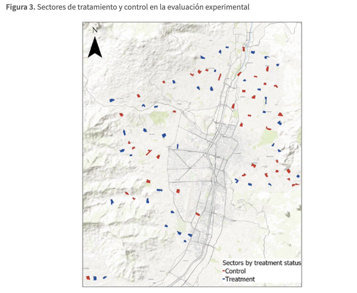 Como complemento a este análisis, realizamos una evaluación experimental. La Alcaldía de Medellín decidió escalar y evaluar una intervención que incluía gestores comunitarios y oferta de diferentes agencias, incluyendo servicios de educación, salud y bienestar /12