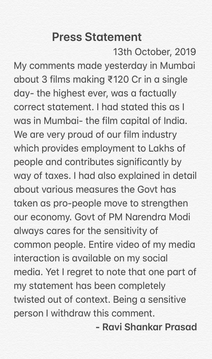 My comments made yesterday in Mumbai about 3 films making ₹120 Cr in a single day- the highest ever, was a factually correct statement. I had stated this as I was in Mumbai- the film capital of India. ...(1/4)