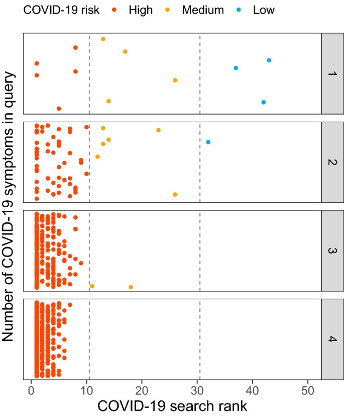 Identificación de casos COVID-19 con respecto al número de términos de consulta ingresados. En el eje x, el rango de búsqueda de la consulta en Symptoma se da frente al eje y, donde cada panel considera un número diferente de síntomas en la consulta.