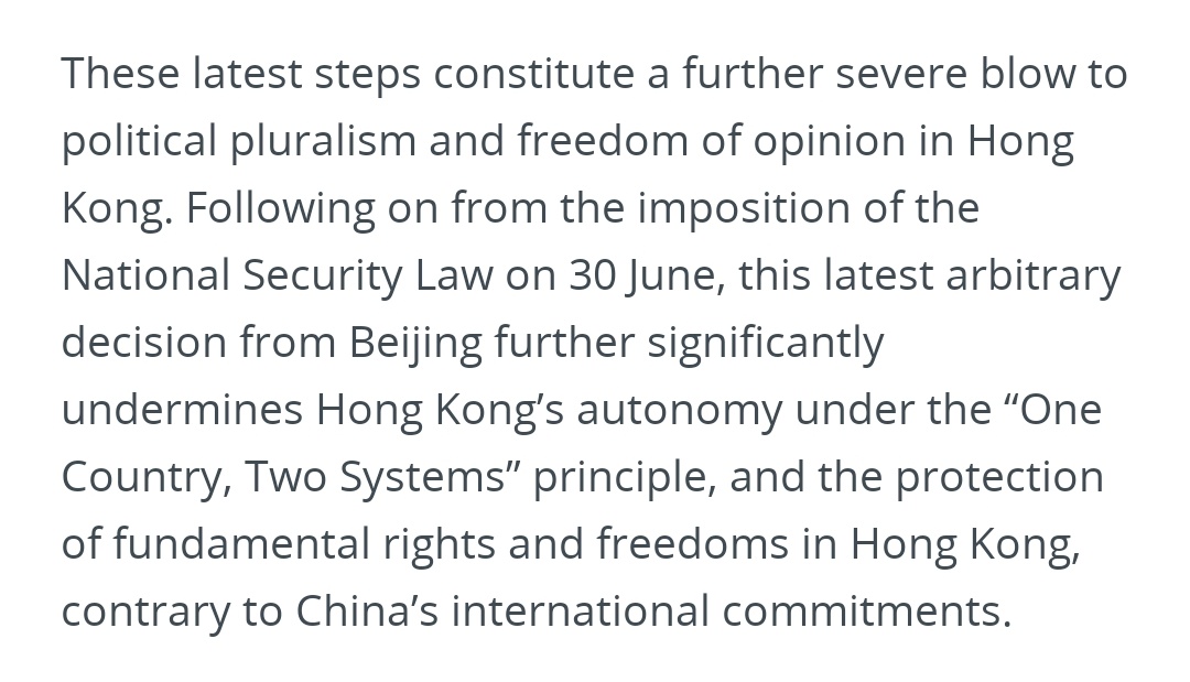 🇪🇺 La UE denuncia que las medidas socavan "aún más la autonomía de Hong Kong" y exige la "reinstalación inmediata de los miembros del Consejo Legislativo"