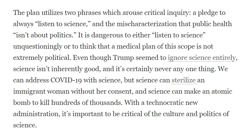 One thing I'm critical of are the simplistic suggestions to "listen to science" unquestioningly, which we'll hear a lot after an explicitly anti-science presidency. But as I illustrate by linking to @TheTinaVasquez's important work, science can facilitate help or harm
