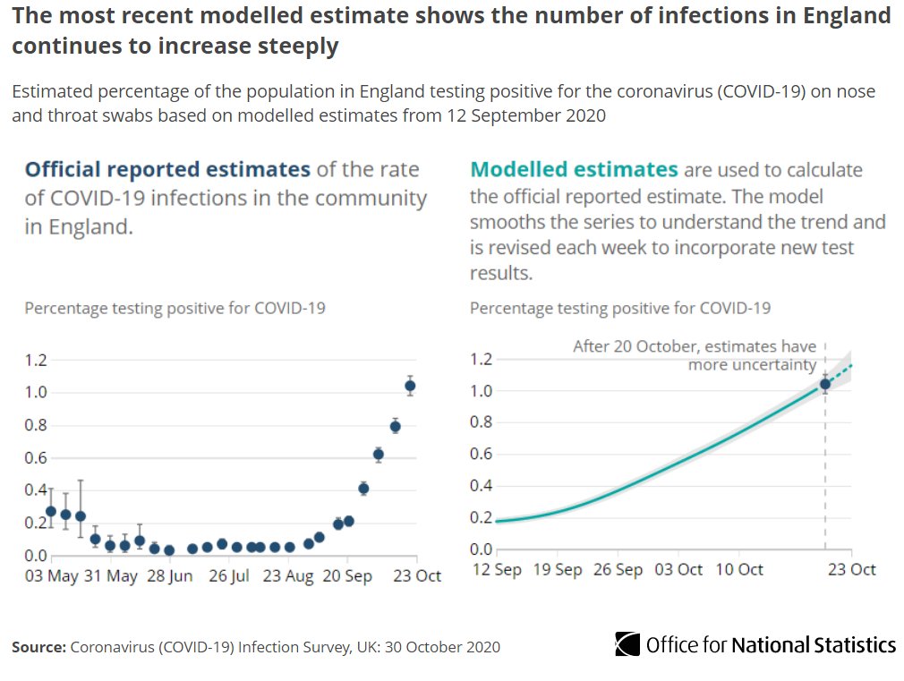 Around 1 in 85 people (not in care homes, hospitals or other institutional settings) in England would test positive for #COVID19 at any given time between 31 Oct and 6 Nov ow.ly/TheN50CjCCB