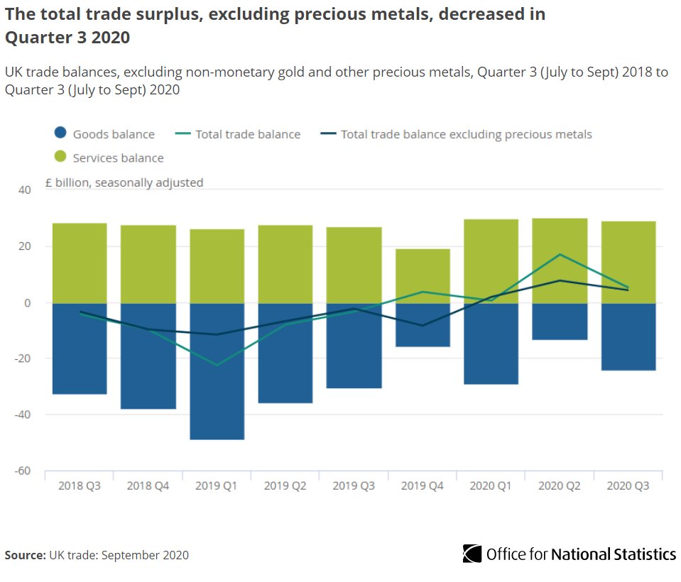 The UK total trade surplus, excluding non-monetary gold, fell £3.4bn to £4.2bn in Quarter 3 2020; imports grew £17.3bn while exports grew £13.8bn ow.ly/DGM450Cim3p