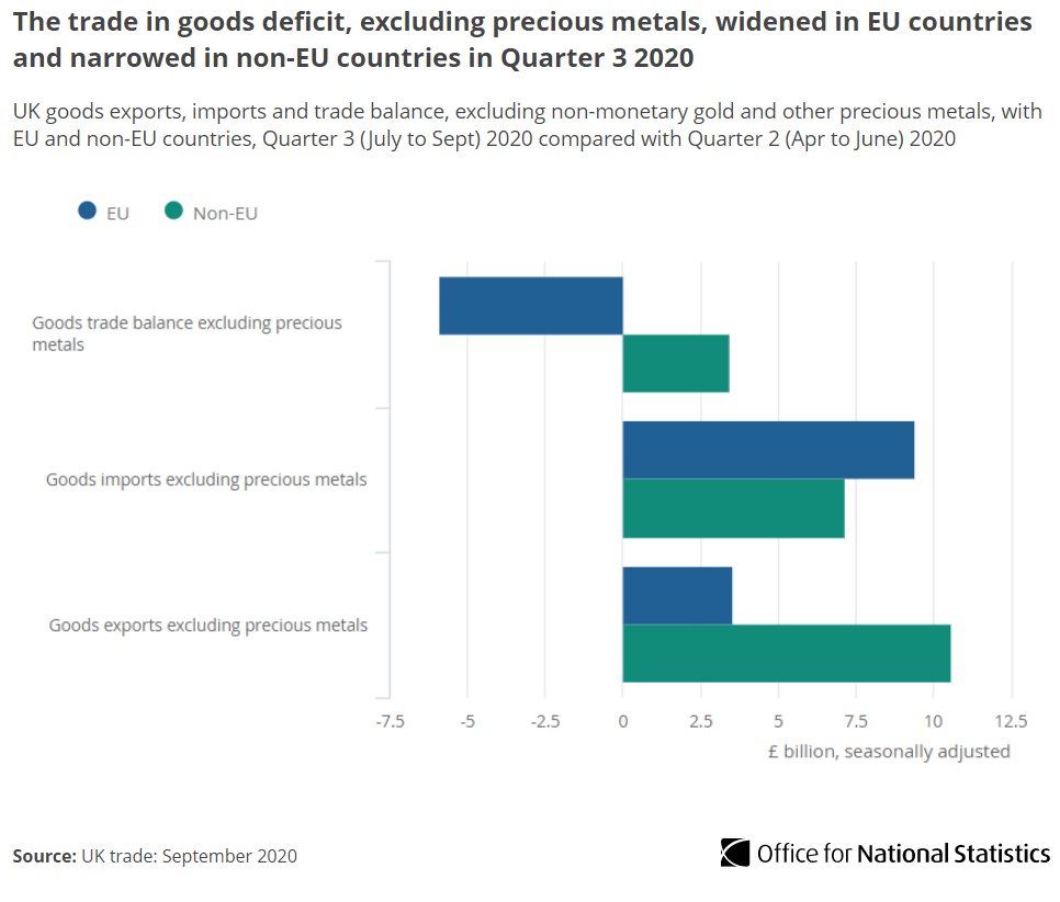 Removing the effect of inflation, the underlying total trade surplus – excluding unspecified goods – narrowed £0.8bn to £7.4bn in Quarter 3 2020; exports grew £15.1bn and imports grew £15.9bn ow.ly/9acJ50Cim5e