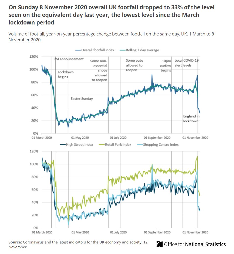 On 8 November 2020, overall UK footfall dropped to 33% of the level seen in on the equivalent day last year after national restrictions were introduced in England, following a surge the day before they came into effect ow.ly/V1Wp50CiqFP