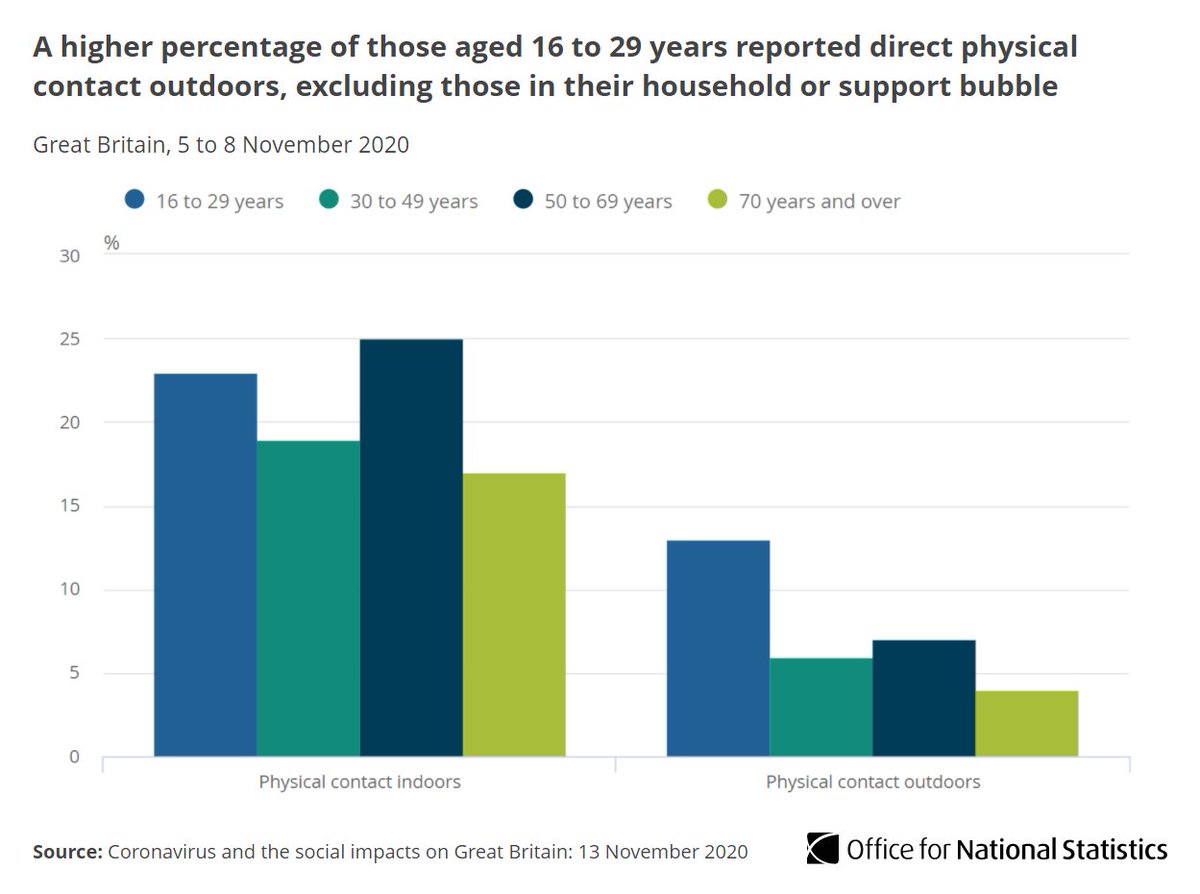 23% of adults aged 16 to 29 said they’d had physical contact with at least one other person when socialising indoors in the last 24 hours, excluding members of their household or support bubble.