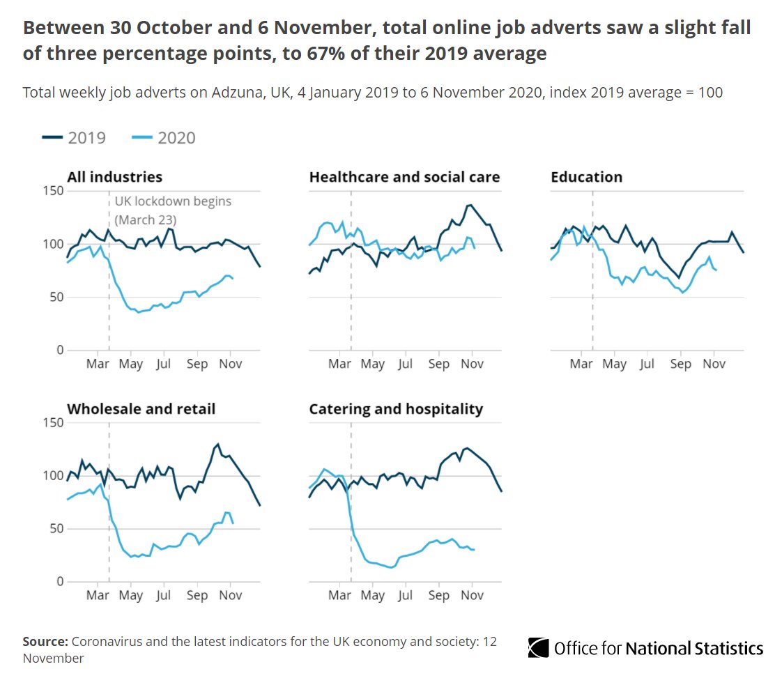 Online job adverts fell for the first time since the beginning of September between 30 October and 6 November to 67% of their 2019 average ow.ly/sjvM50CiqQ6