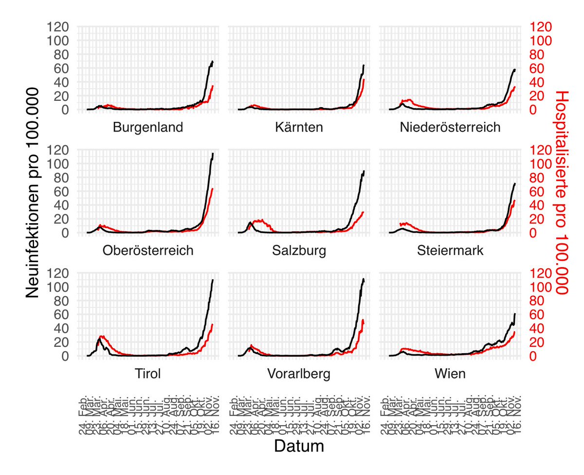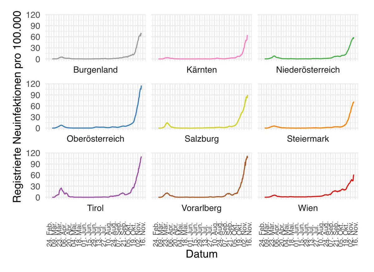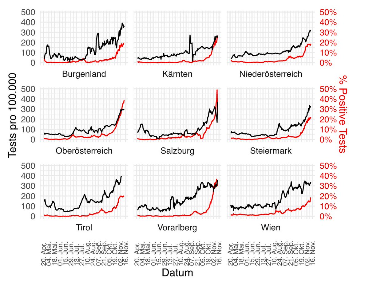 System z.B. in den letzten Tagen ungefähr 1000 Fälle, heute ungefähr 2000. Aus Wien höre ich (via @mariodujakovic), dass es heute ca. 1400 neue Fälle gegeben hat. Ich publiziere trotz allem heute meine täglichen Grafiken, weil ich gar keine Grafiken statt ungenauer Grafiken