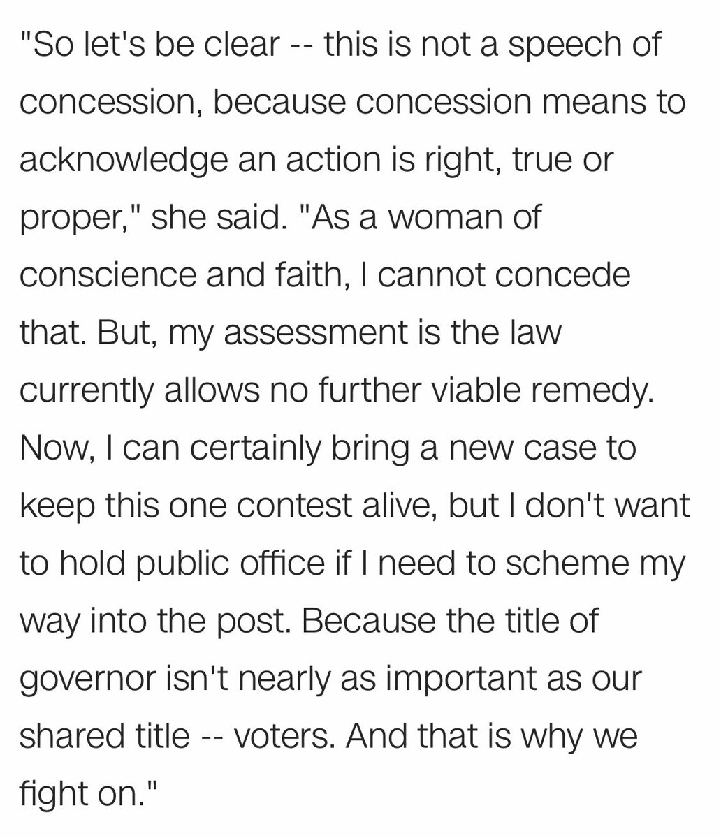 Abrams did ultimately end her campaign and state that Kemp won on November 17. She refused to refer to her speech as a concession speech, stating: