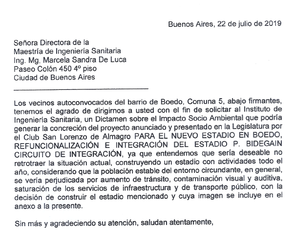 Por medio de la presente, la agrupación vecinal "Vecinos Unidos por Boedo" desea aclarar algunas cuestiones relacionadas con el informe del estudio de impacto ambiental difundido recientemente.