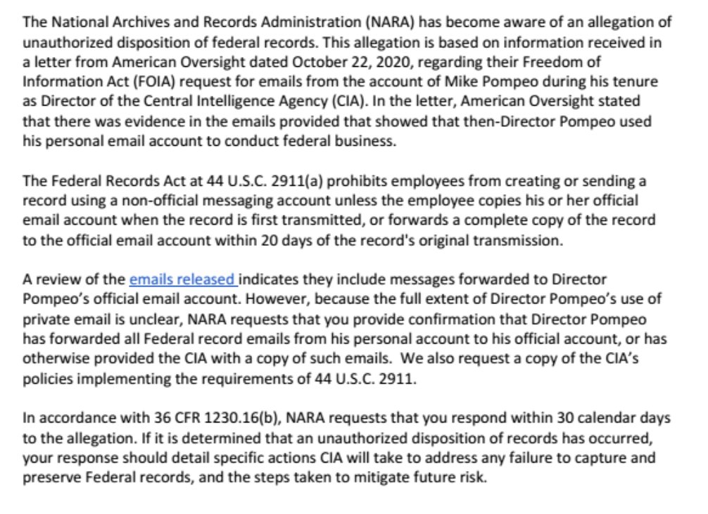 NEW: The fight to preserve Trump administration records has begun. The day after the election, the National Archives asked the CIA for a report on Mike Pompeo’s personal email use as director, responding to a complaint we submitted. americanoversight.org/document/lette…