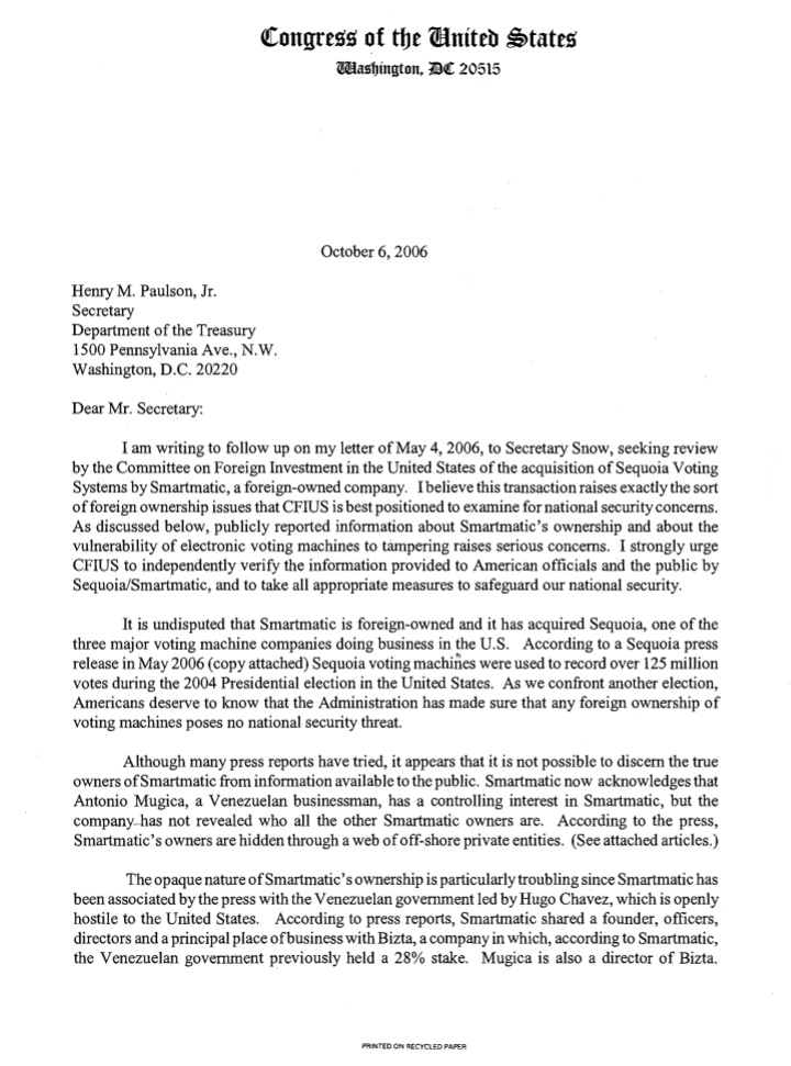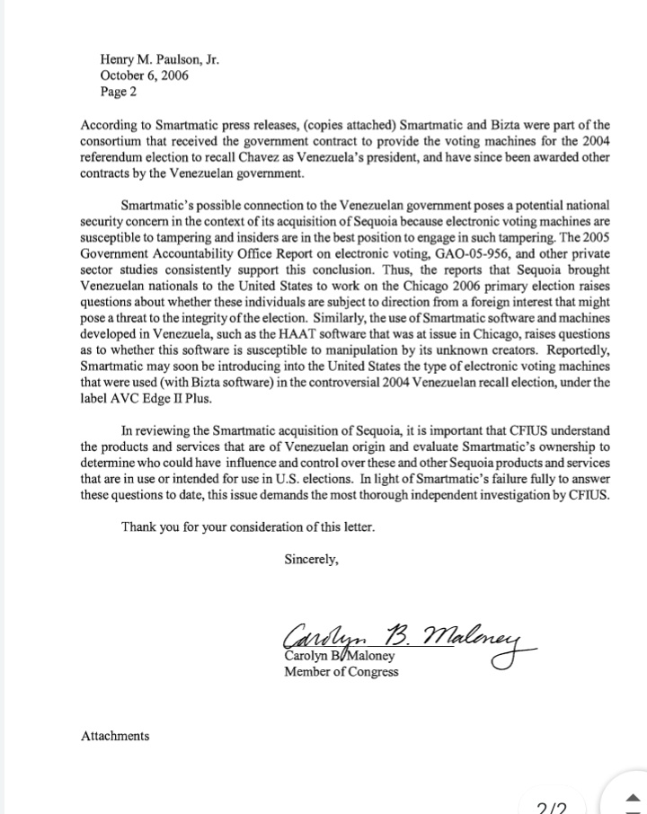 Carolyn Maloneys 2006 follow up letter to Henry Paul's on Jr, Department of the Treasury, raising concerns about foreign owned Smartmatic and its acquisition of sequoia