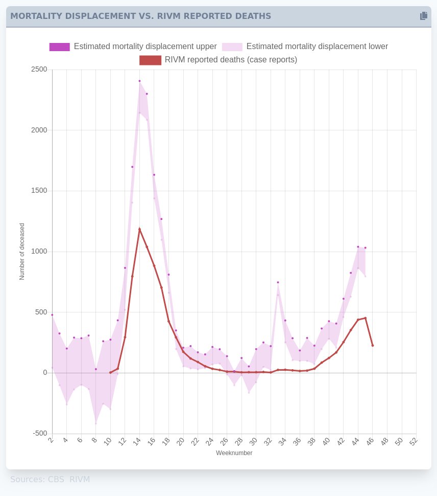4/ π€ The @statistiekcbs reported on mortality displacement for week 45. They estimate the displacement to be ~700 higher than normal. @RIVM has so far reported 453 deceased in the same week. The actual number of COVID-19 deaths is most likely between 453 and 700.