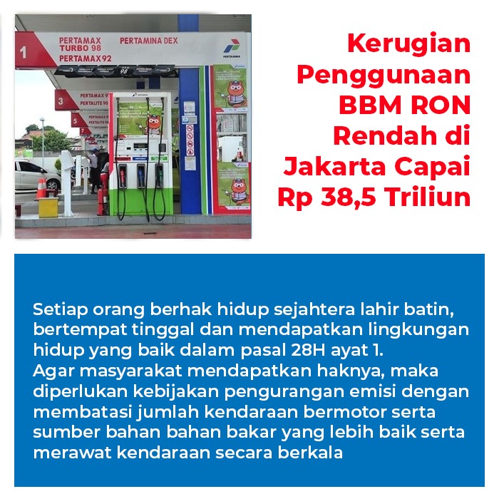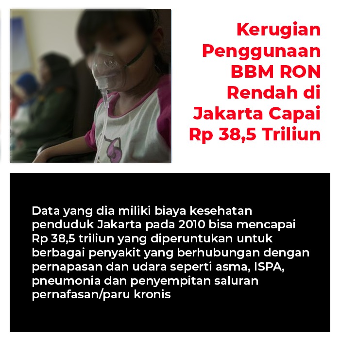 Bahkan dampak pencemaran udara akibat emisi tinggi BBM beroktan rendah di Jakarta saja bisa menimbulkan kerugian Rp 38,5 triliun untuk biaya pengobatan.