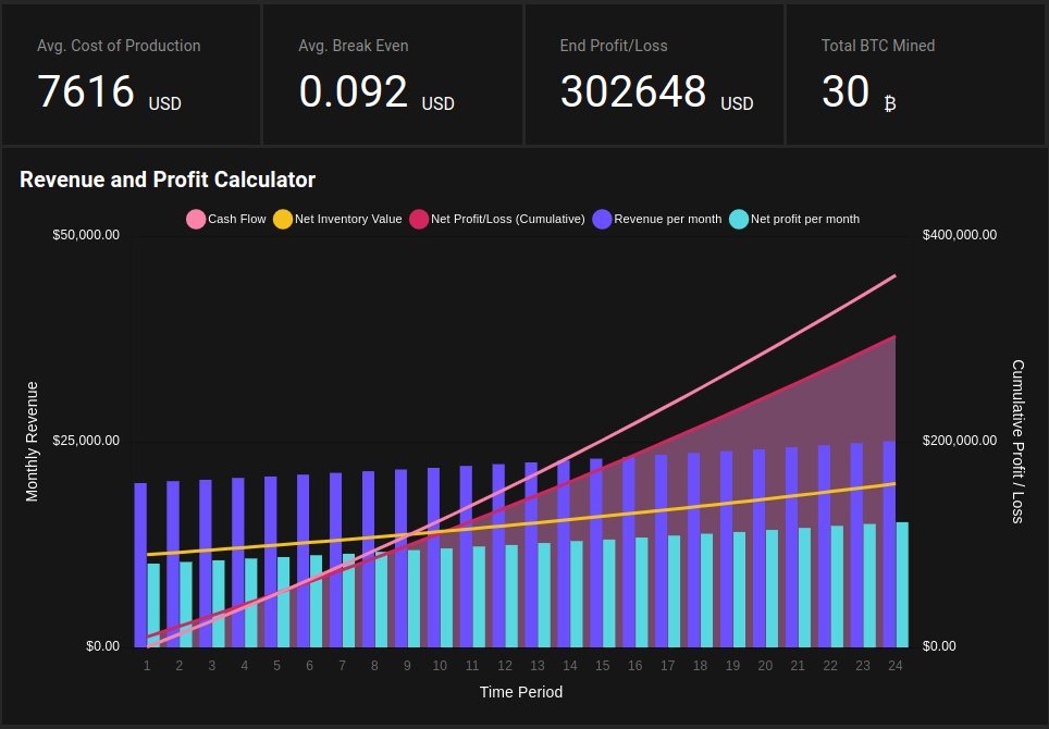 3/ The Profitability & Cash Flow calculator is provides a customizable visualization of a mining operation's cash flow including initial CAPEX and fluctuating asset values (e.g. for ASICs).