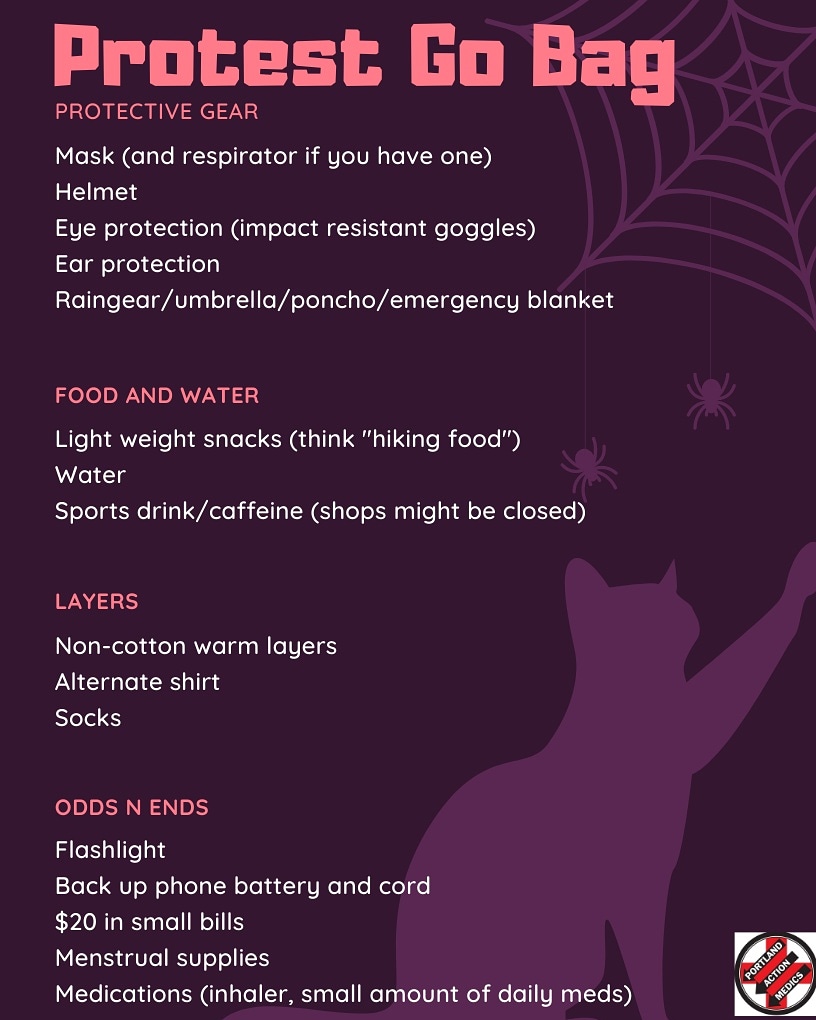 Always packed and ready to go. Things can be added day of when time permits. During the summer many of us were at protests most nights, sleeping a bit, going to work, then back to the protest.