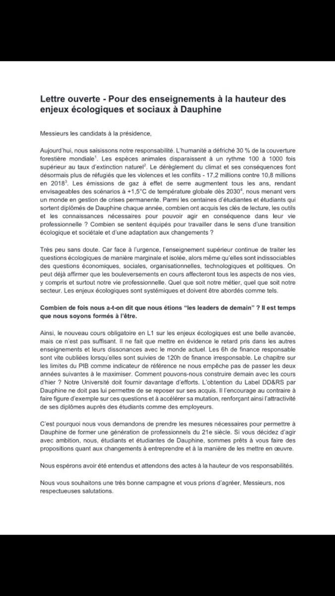 1000 étudiant.e.s de l’Université @Paris_Dauphine signent une lettre aux candidats à la Présidence de leur établissement pour demander des enseignements à la hauteur des enjeux écologiques et sociaux. 👩🎓👨🎓