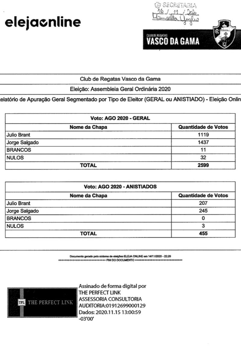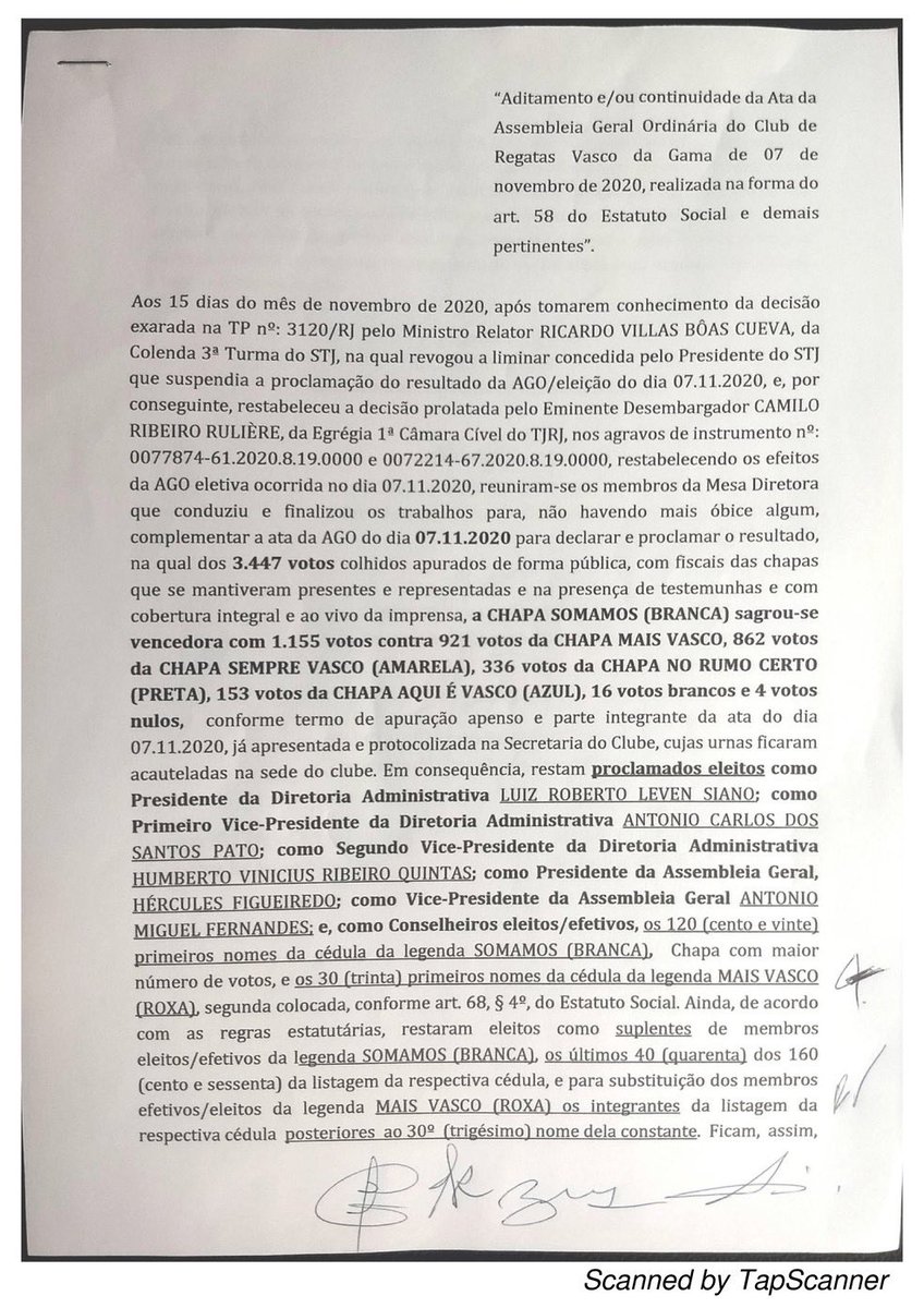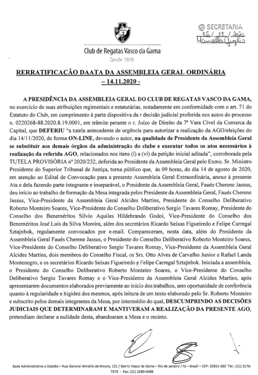 A ata protocolada por Mussa, presidente da Assembleia Geral, se refere ao pleito do dia 14 de novembro, declarando Jorge Salgado, da Mais Vasco, como vencedor das eleições. Porém o resultado ainda está sub-judice. Por quê? 👇🏽