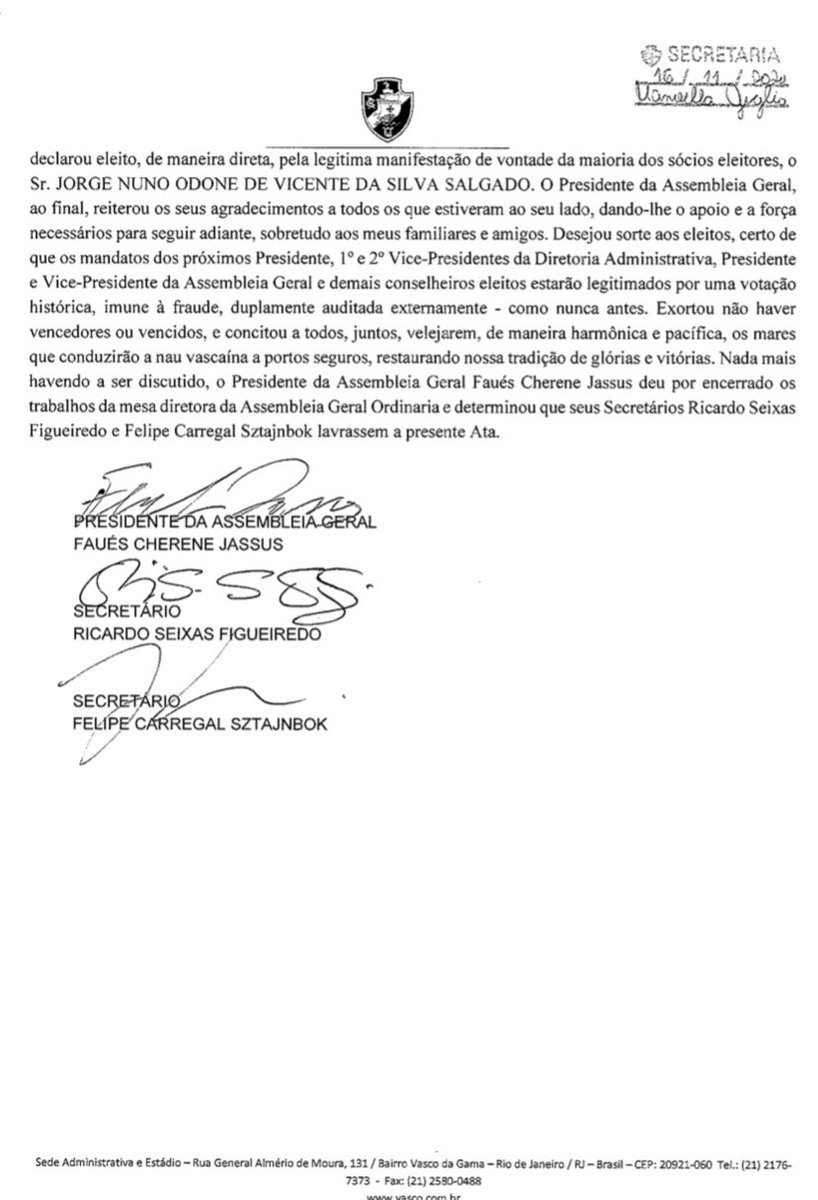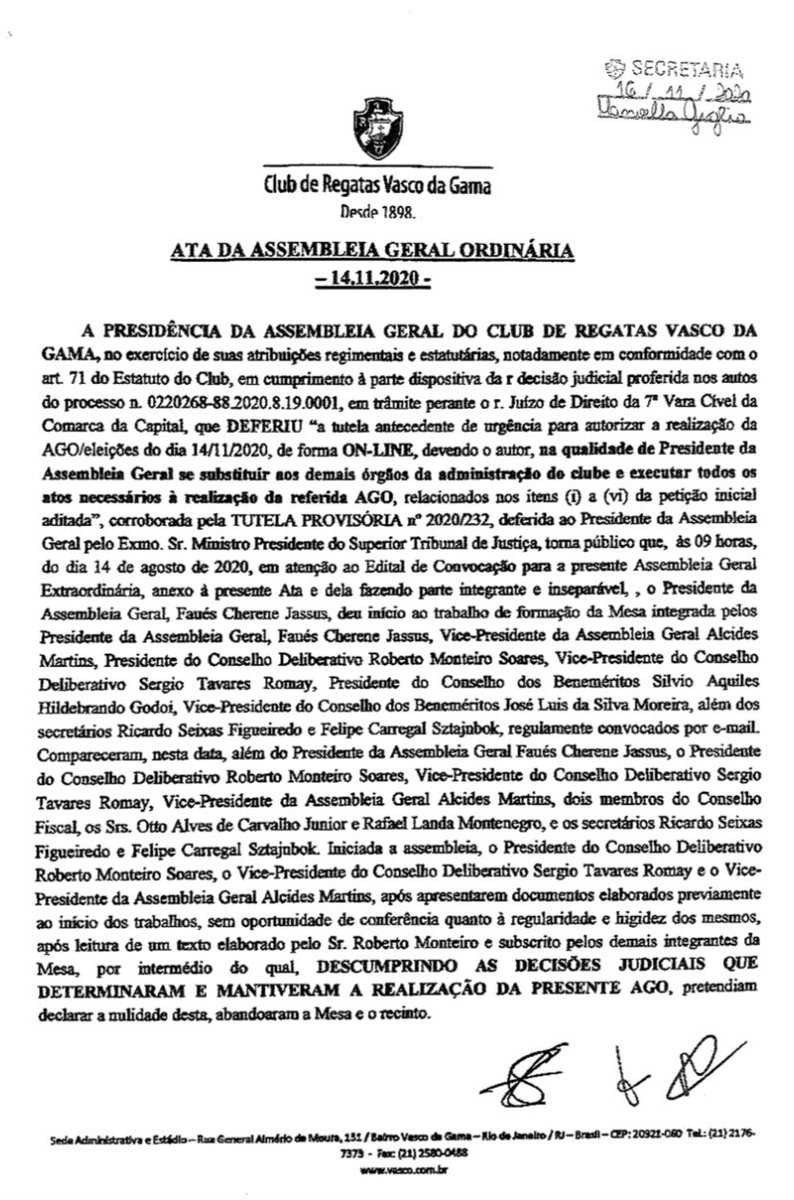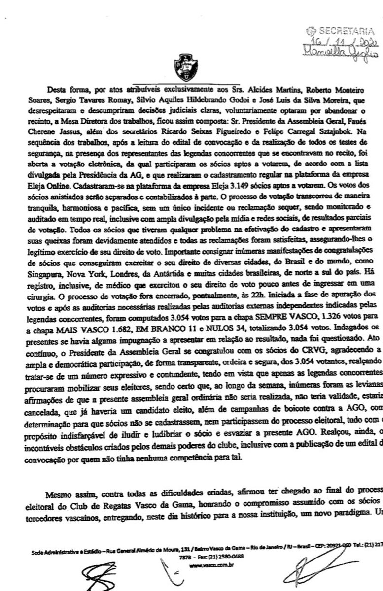Faues Mussa, presidente da Assembleia Geral, protocolou a ata das eleições do dia 14 de novembro na Secretaria do Vasco. Foram 13 páginas do documento, que também contou com conteúdos da empresa The Perfect Link, uma das responsáveis por auditar a Eleja Online. PARTE 1: