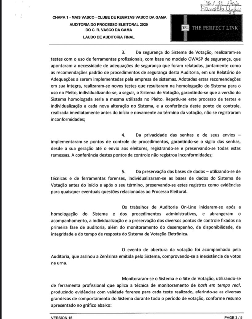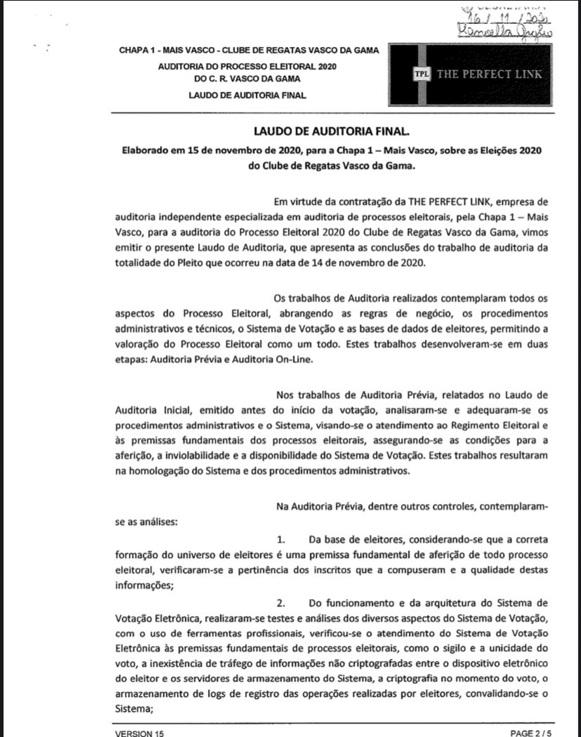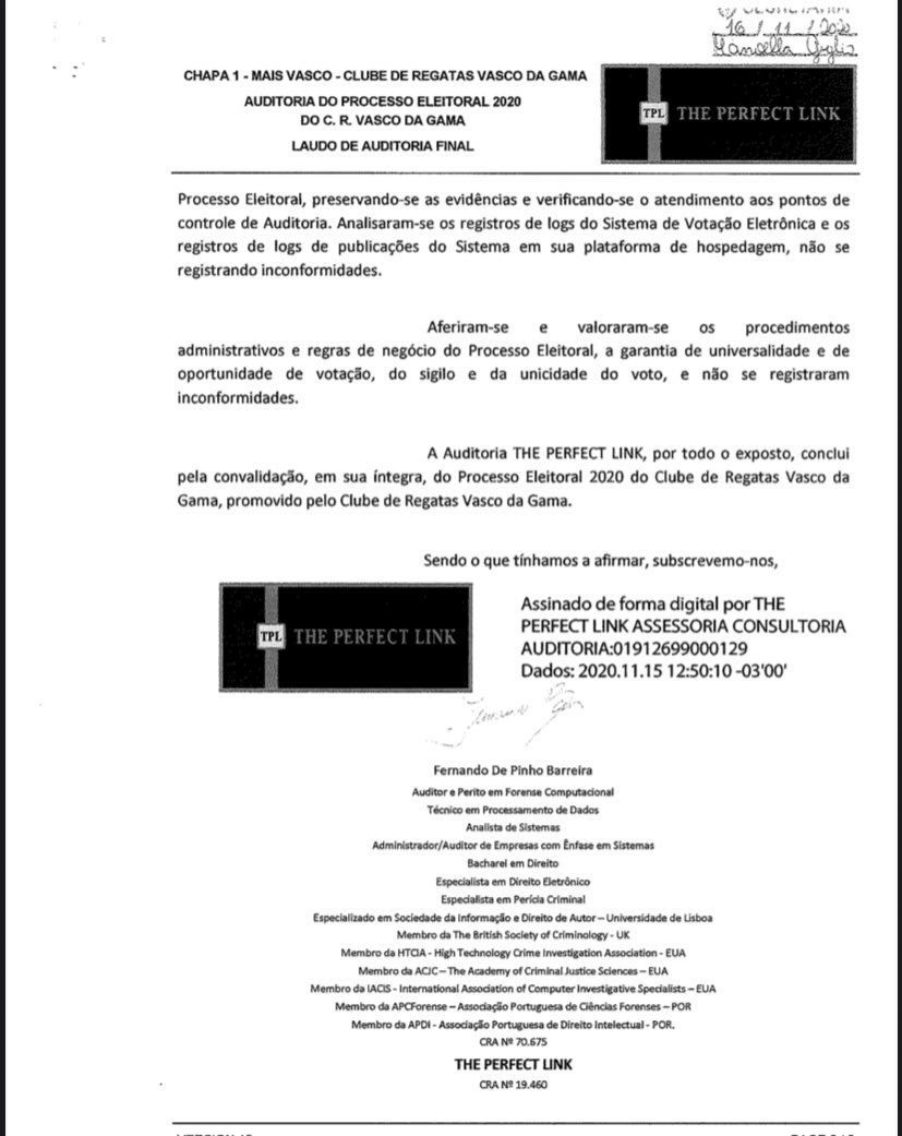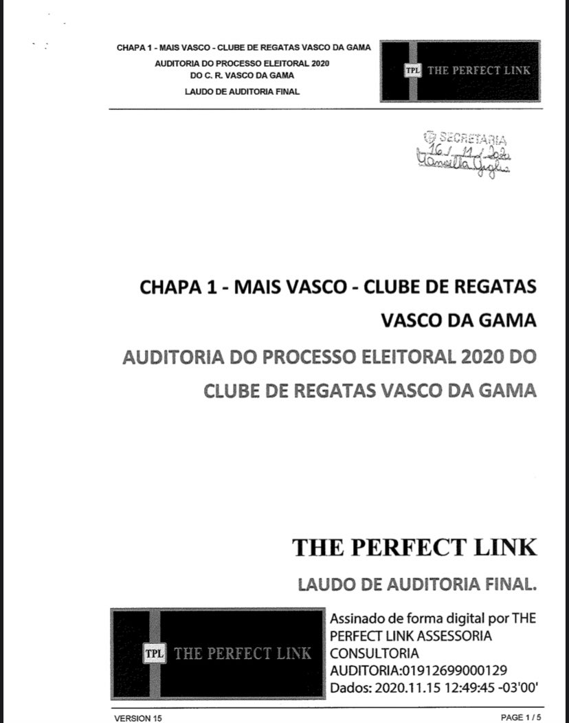 Faues Mussa, presidente da Assembleia Geral, protocolou a ata das eleições do dia 14 de novembro na Secretaria do Vasco. Foram 13 páginas do documento, que também contou com conteúdos da empresa The Perfect Link, uma das responsáveis por auditar a Eleja Online. PARTE 1: