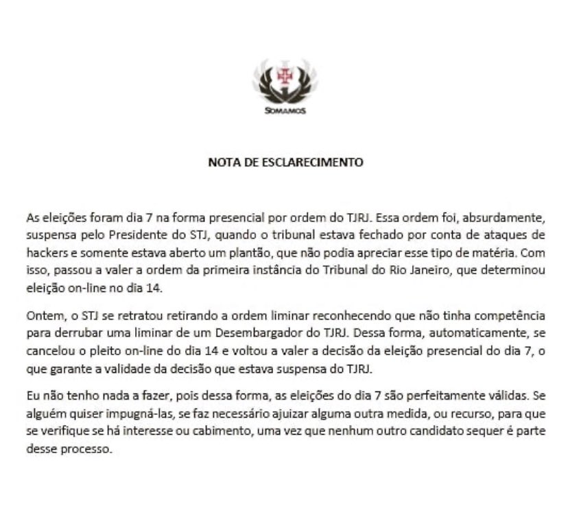 Boa tarde, queridos. Vamos fazer um resumo das notícias do Vasco que ocorreram neste domingo e também na manhã desta segunda-feira para partirmos do ponto em que paramos na manhã de ontem. 1° com a nota do Somamos, grupo de Leven Siano, que já se declara como presidente. 👇🏽