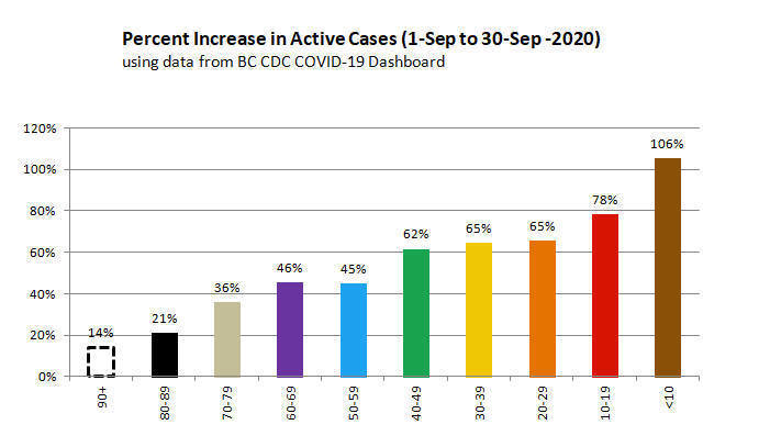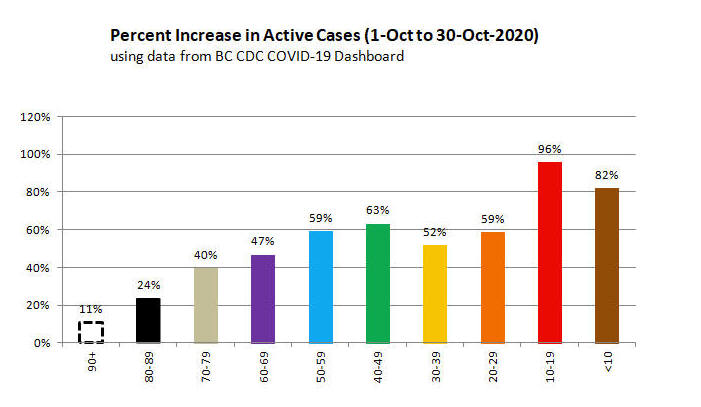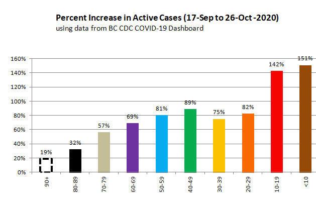 4/ With normalized data, *the graphs still show that the 20-29 & 30-39 groups have highest active cases per 100,000 people*. Notice the 90+ group (dashed black line) has moved to 3rd highest. The 10-19 & <10 groups remain below the middle of the pack. Was Bonnie Henry right?
