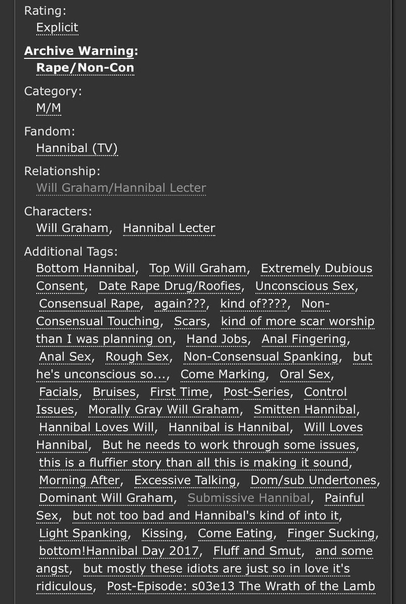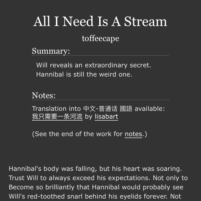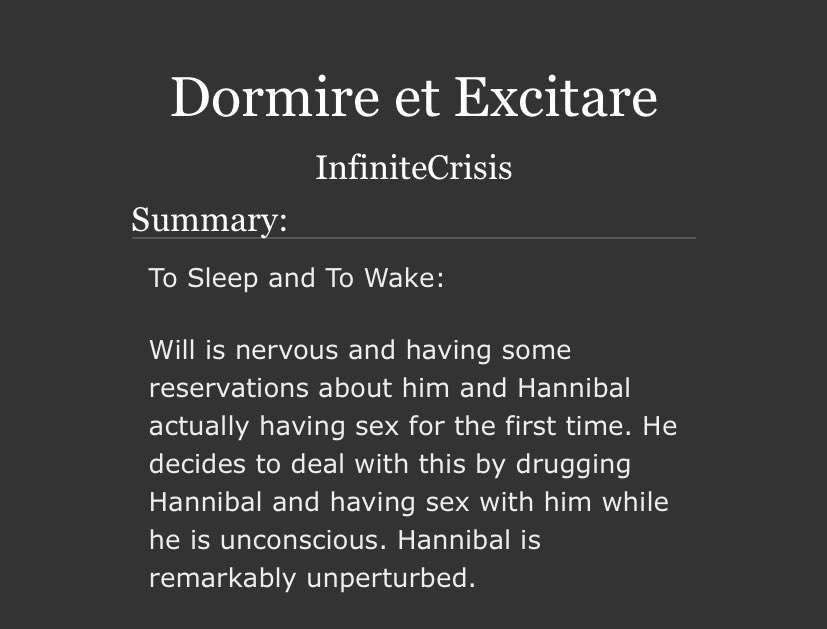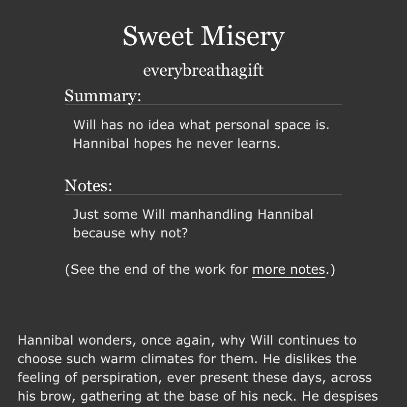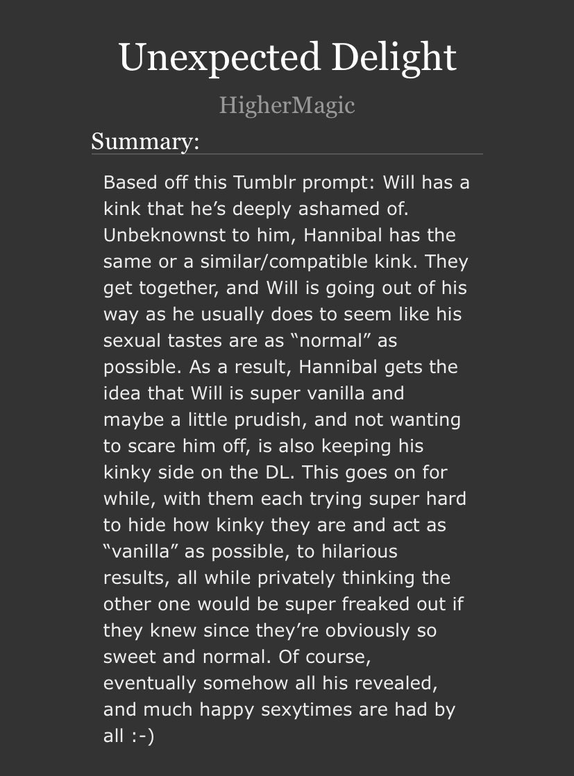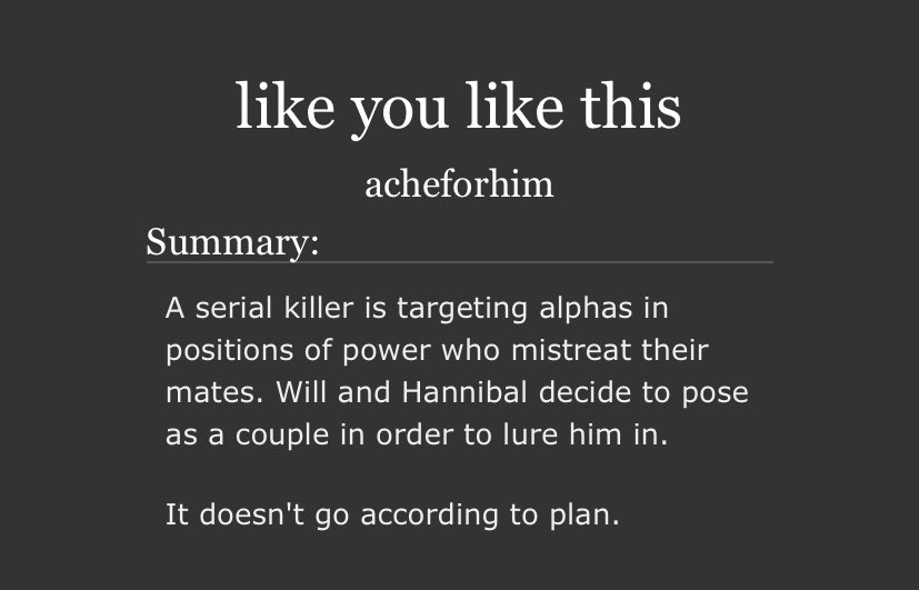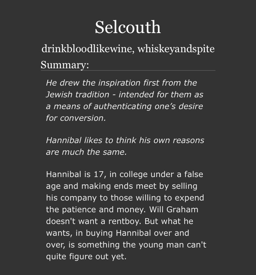 An incredible take on Sub!Hannibal and Dom!Will. Will makes a cruel, cruel Dom here and Hannibal is extremely into it. Note the Non-con tag - this is very dark. But it’s not unhappy.