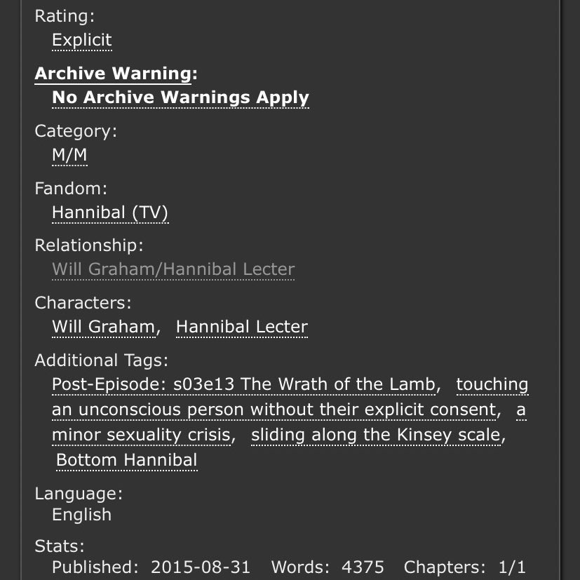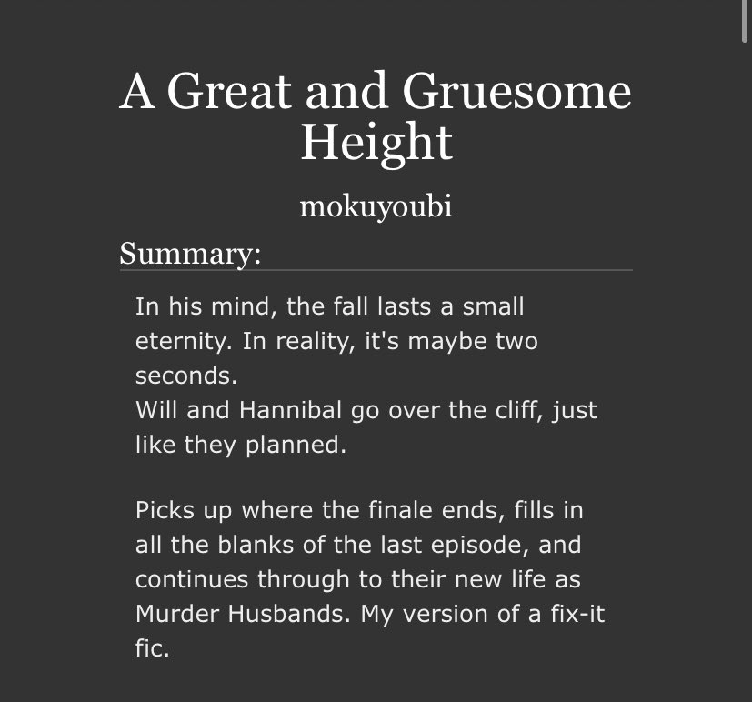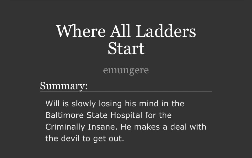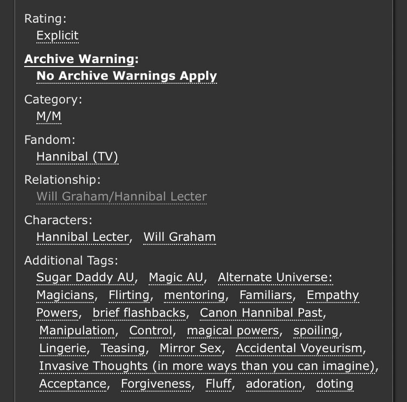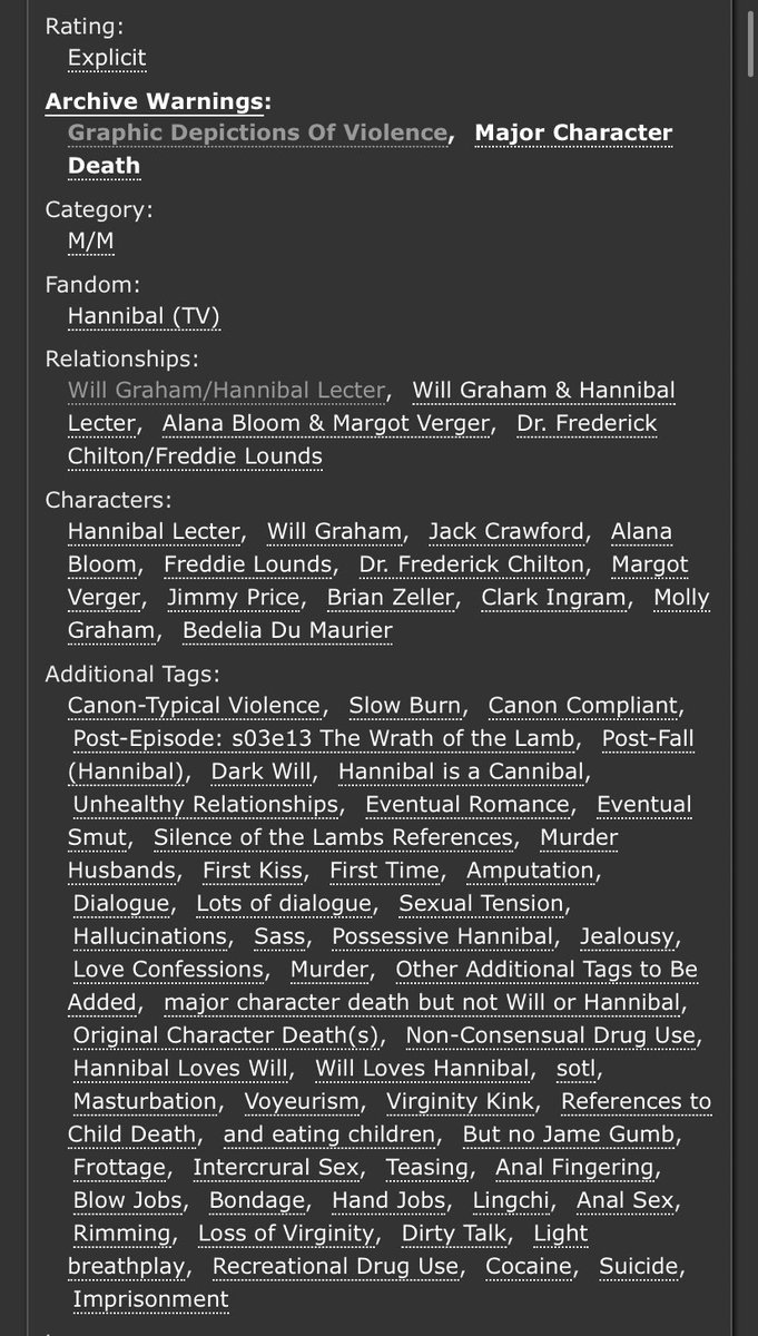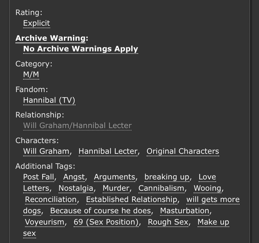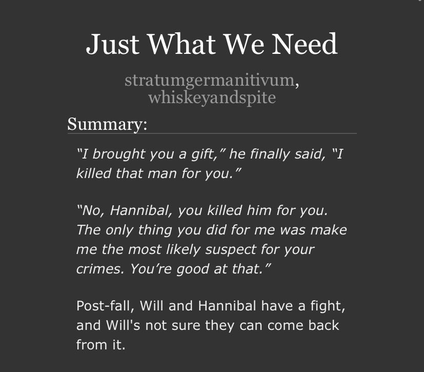 An incredible take on Sub!Hannibal and Dom!Will. Will makes a cruel, cruel Dom here and Hannibal is extremely into it. Note the Non-con tag - this is very dark. But it’s not unhappy.