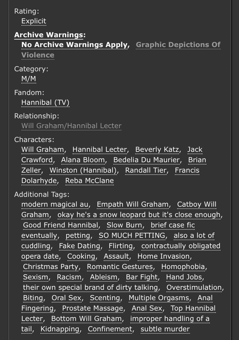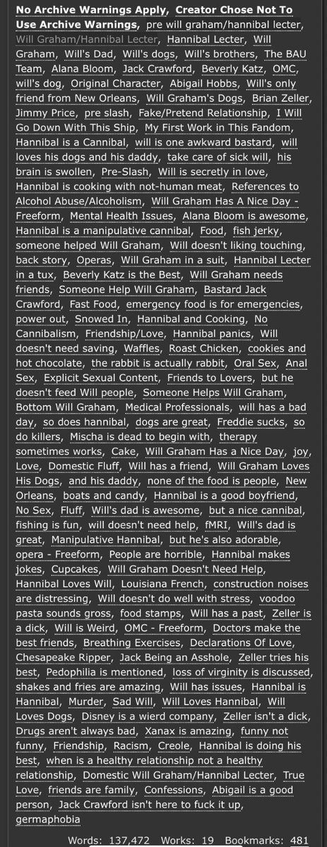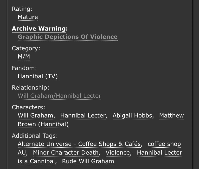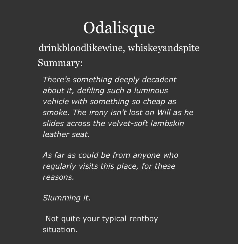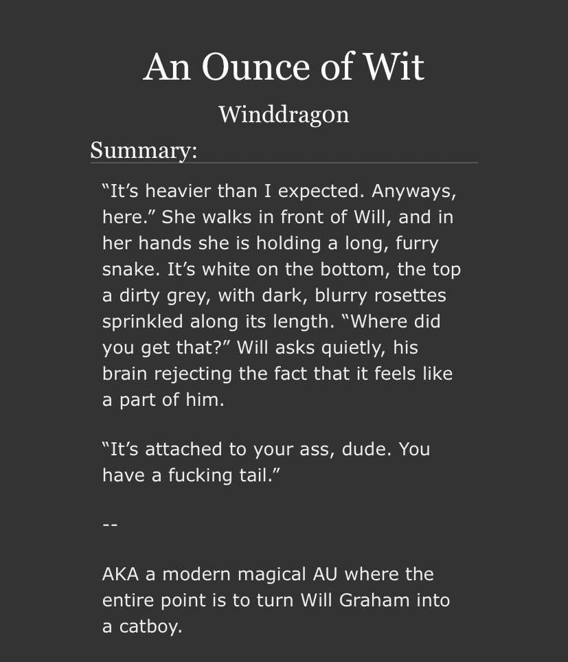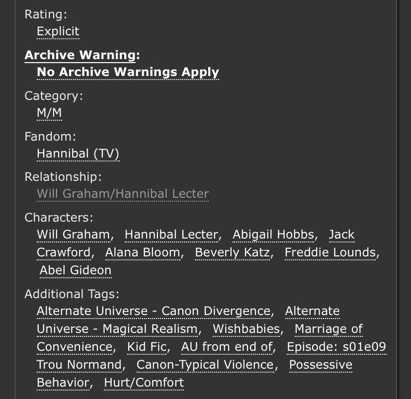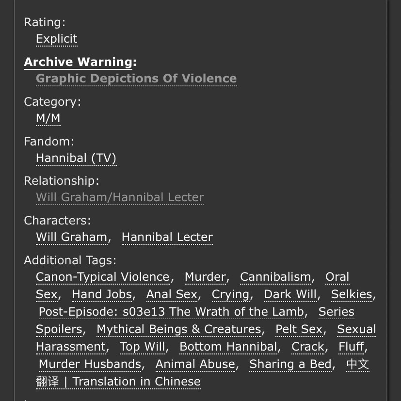 An incredible take on Sub!Hannibal and Dom!Will. Will makes a cruel, cruel Dom here and Hannibal is extremely into it. Note the Non-con tag - this is very dark. But it’s not unhappy.