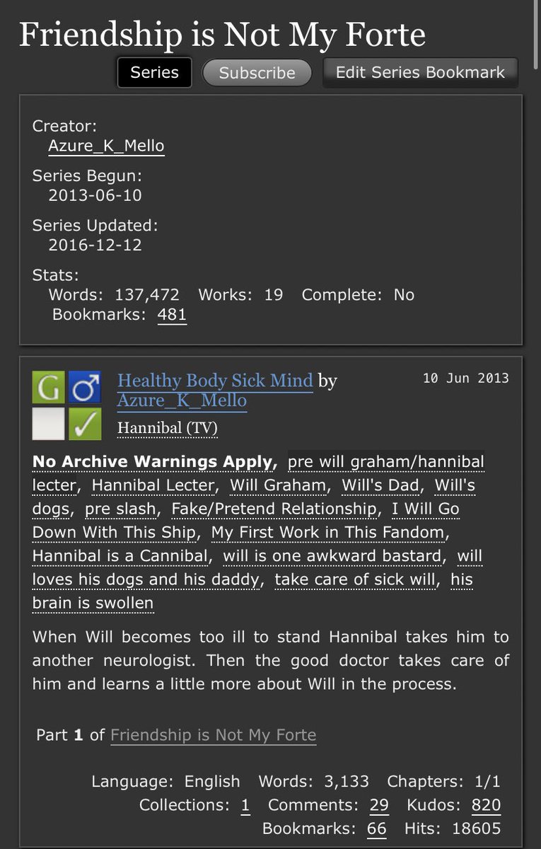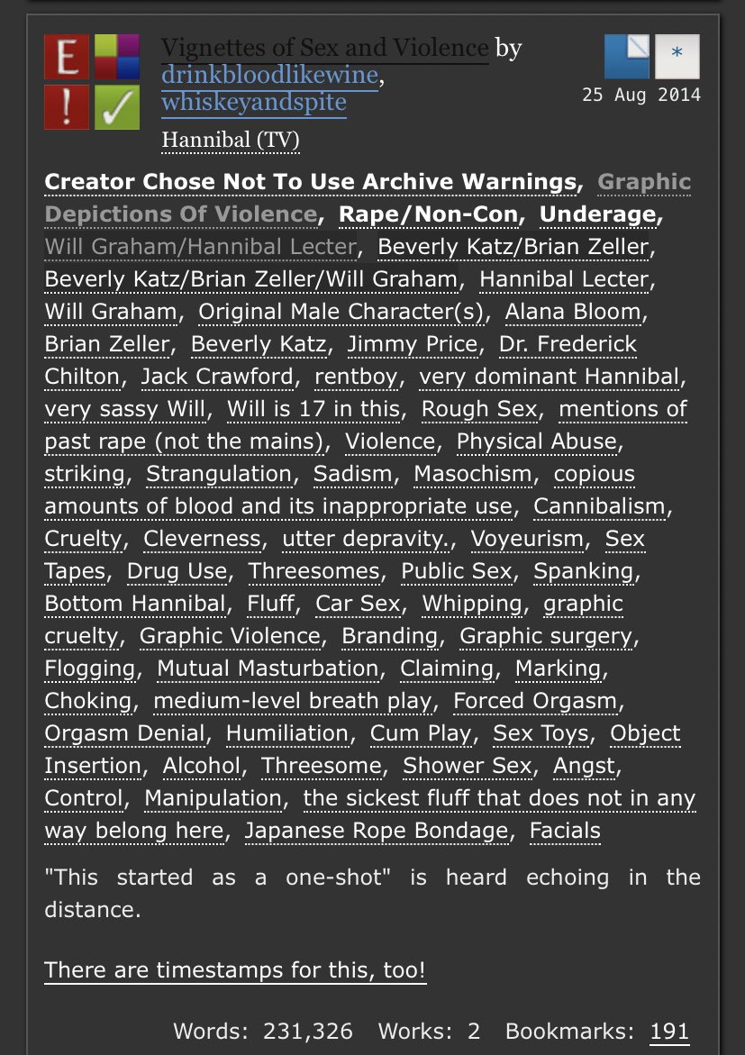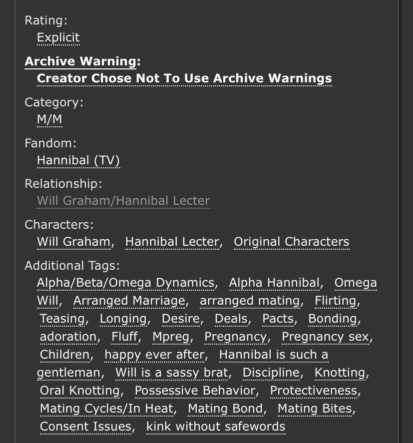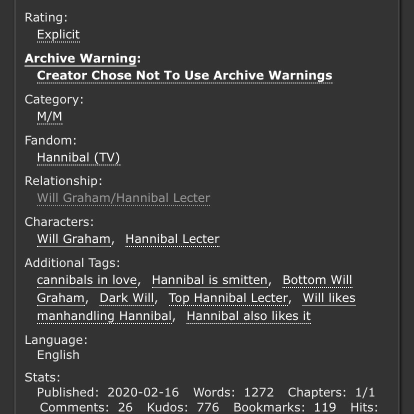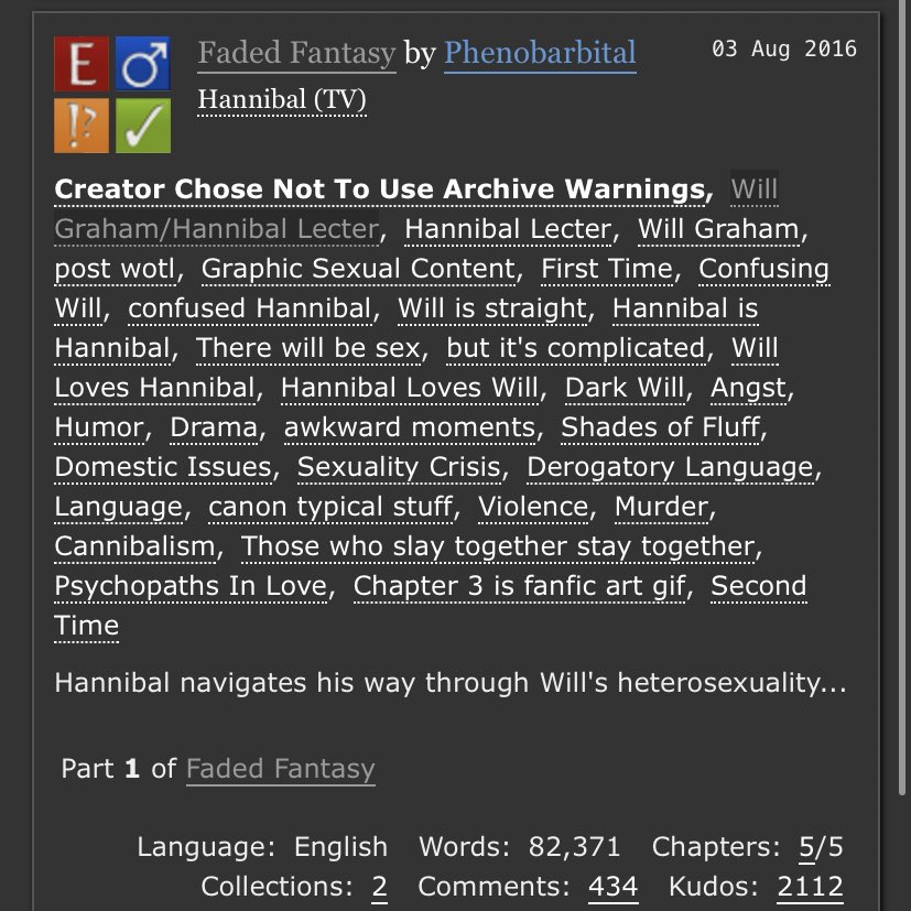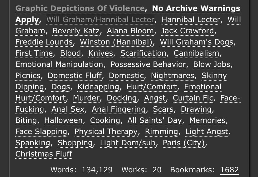 An incredible take on Sub!Hannibal and Dom!Will. Will makes a cruel, cruel Dom here and Hannibal is extremely into it. Note the Non-con tag - this is very dark. But it’s not unhappy.