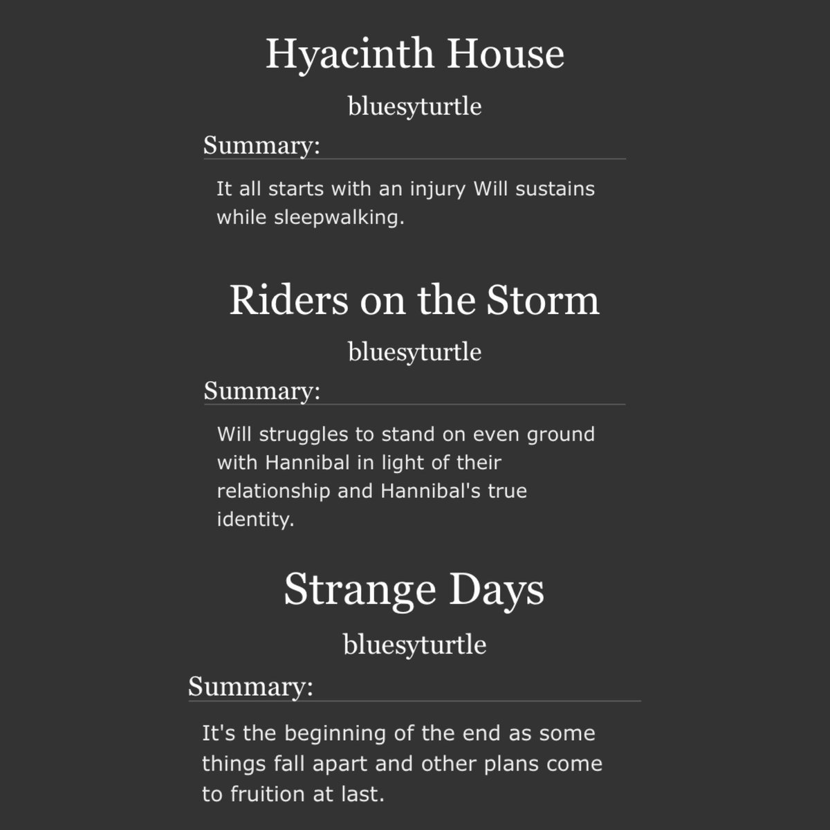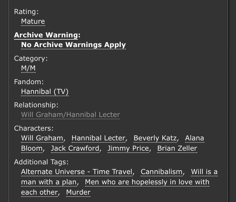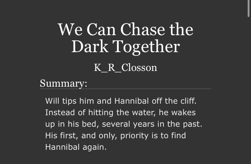 I’m not normally one for time travel fics but I really like this one. Post-Fall Will goes back in time to his life before he meets Hannibal and decides to pursue him first this time.