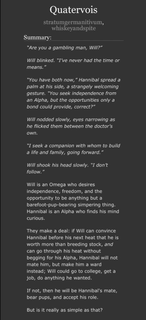 The first omega he acquired was Will. When he showed up on Hannibal’s doorstep one night clothing well-kept but second hand, hair combed neatly, & face flushed, Hannibal acquiesced to his pleas for shelter and took him in. They had both been young & were surprised by Will’s heat.