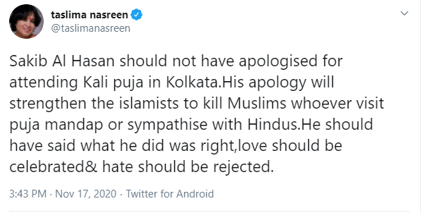 .@taslimanasreen takes to Twitter to say that Bangladeshi cricket Shakib al Hasan should not have apologised for attending Kali Pujo in Kolkata.