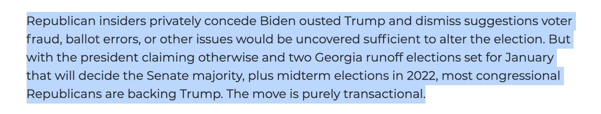 Per below, top Republicans don't actually believe the vote was subject to fraud but are pretending to for political expediency. They fear that saying Biden won will alienate Trump's base ahead of critical GA elections and cost GOP their Senate majority washex.am/35bemGB