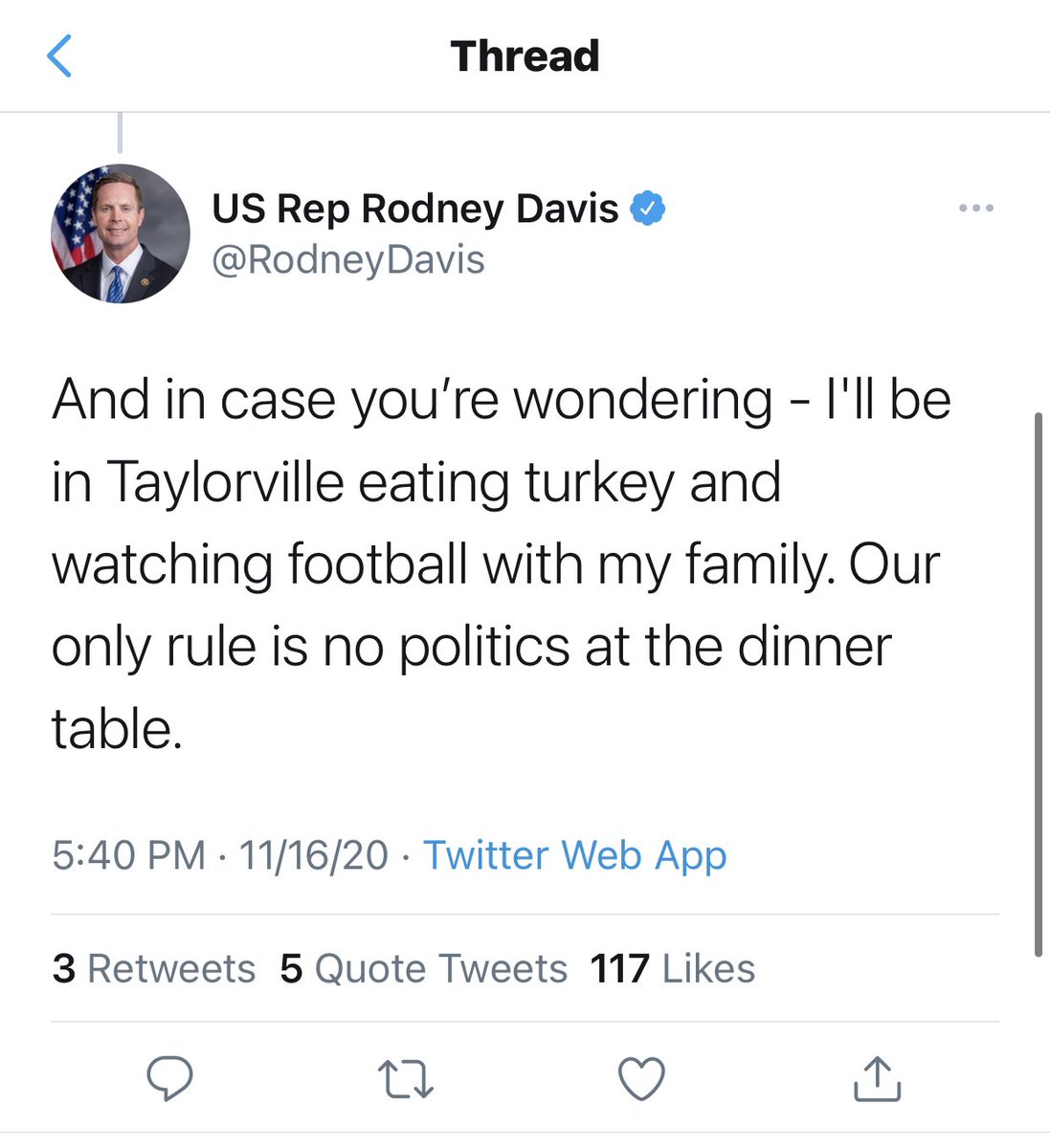 This is from the Congressman’s official Twitter account. It’s nice how he added the coda about where he will be celebrating - just to really twist the knife. Super civil. Lest you think this is an errant tweet - his account reposted it today